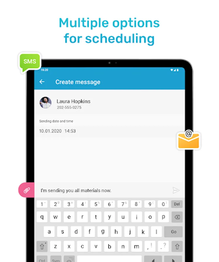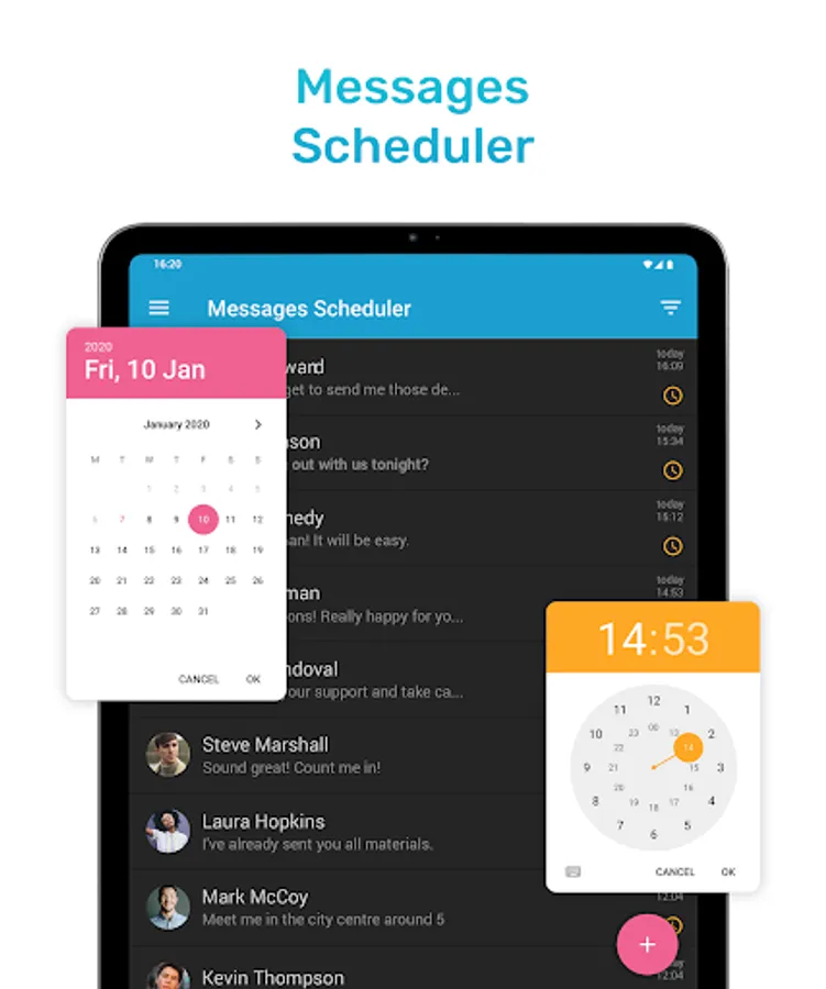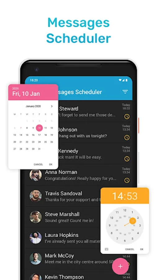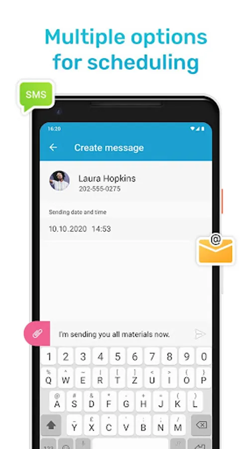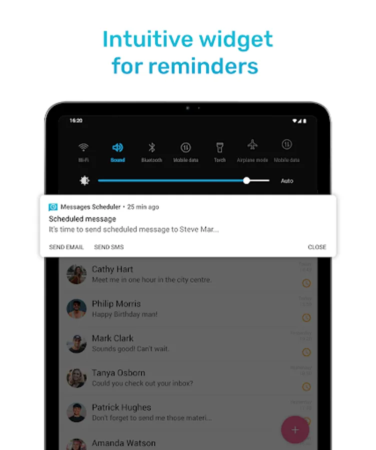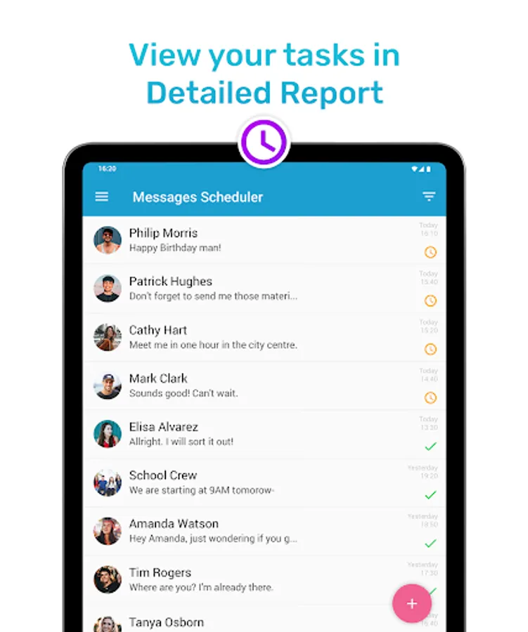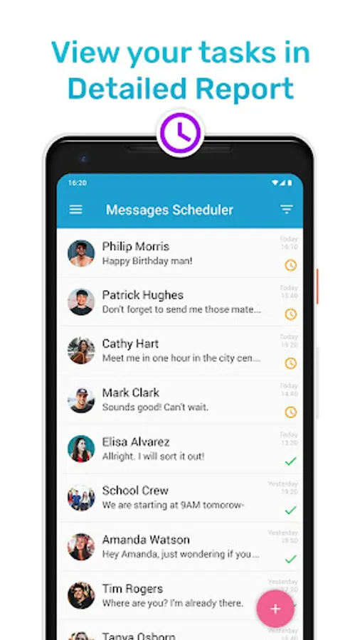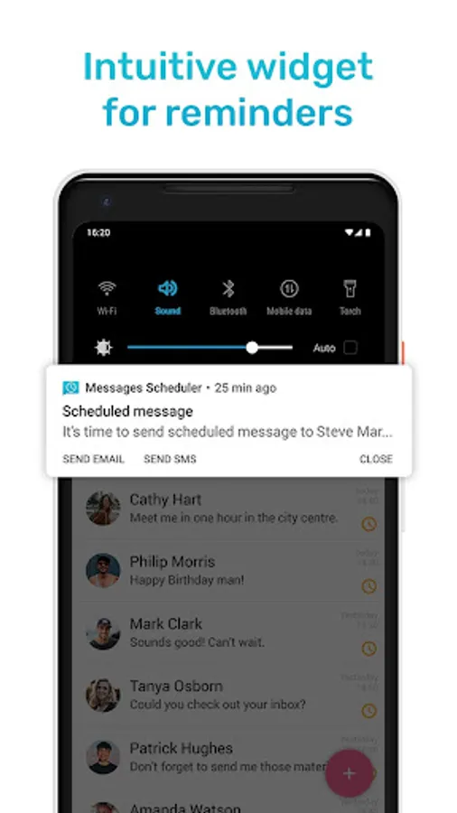 With Messages Scheduler for Android never forget to send a message. Create Scheduled Message with reminder on selected time and date. You can send SMS or MMS with text, pictures, video or Gif. Intuitive and fast SMS Reminder/Scheduler.