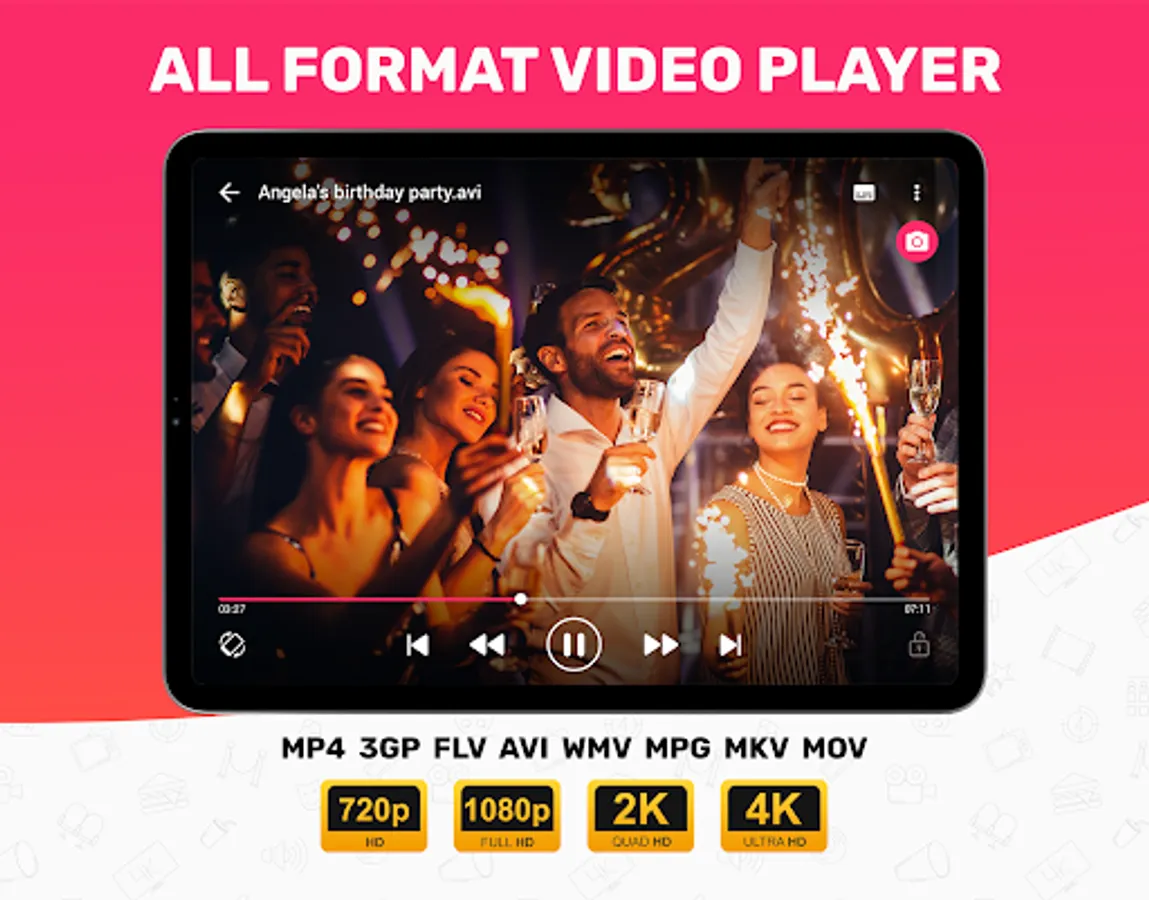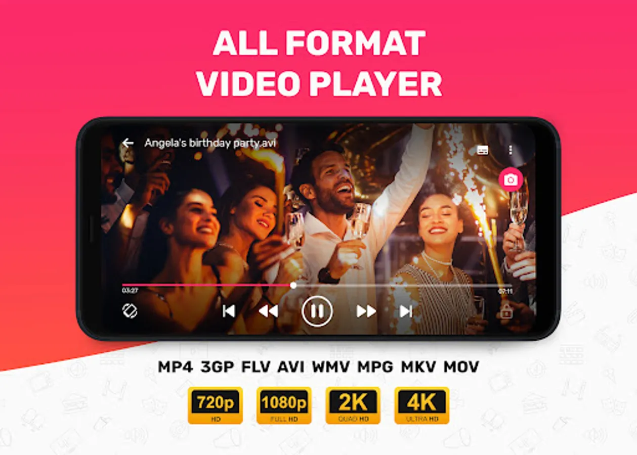 - Video player supports various formats included AVI, MOV, MKV, FLV, 3GP, MP4, WMV, etc.