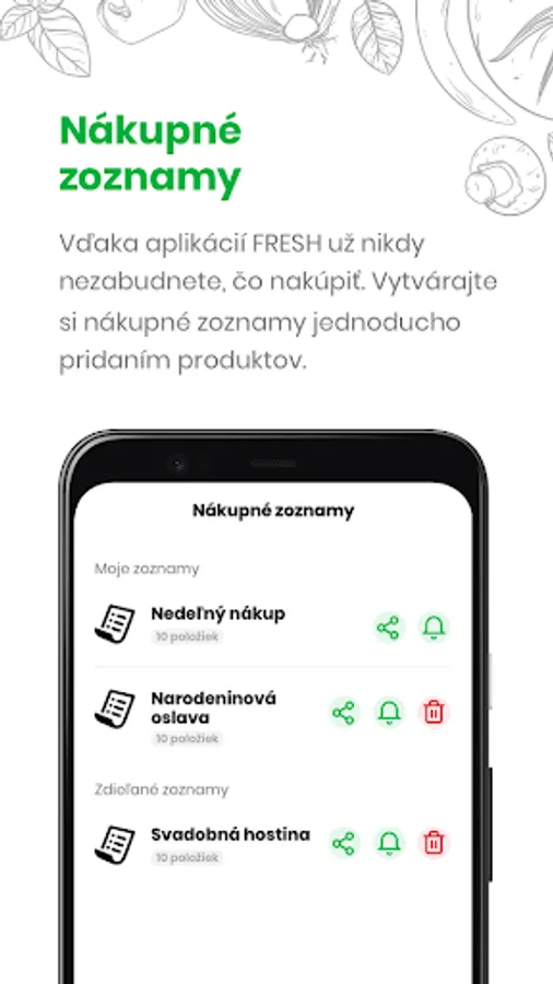 Shopping Lists - With FRESH, you'll never forget what to buy. Create shopping lists simply by adding products from stock flyers, your favorites, or the entire catalog of our product range. You can share shopping lists with your friends, so your partner will never forget to buy your favorite delicacy.