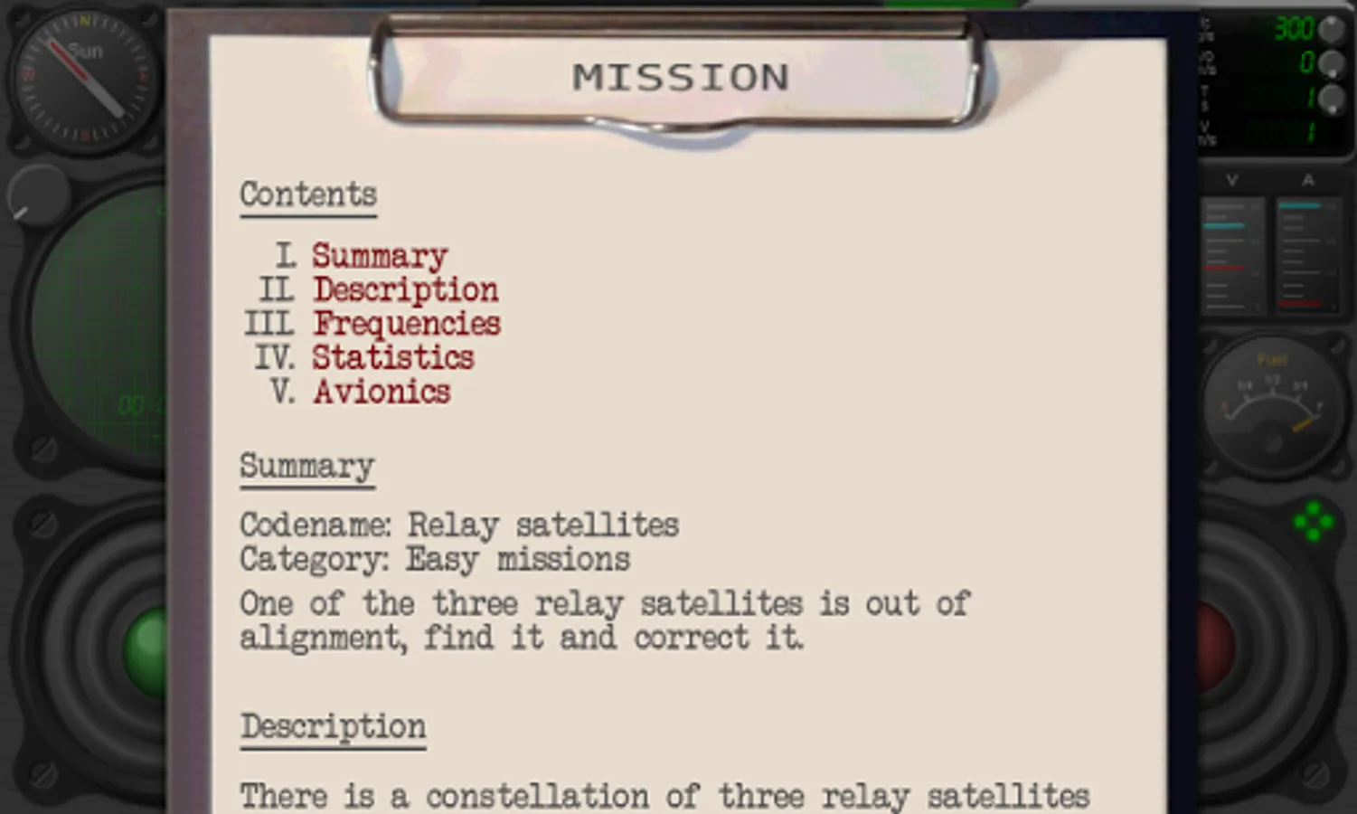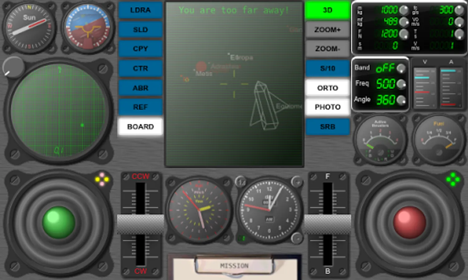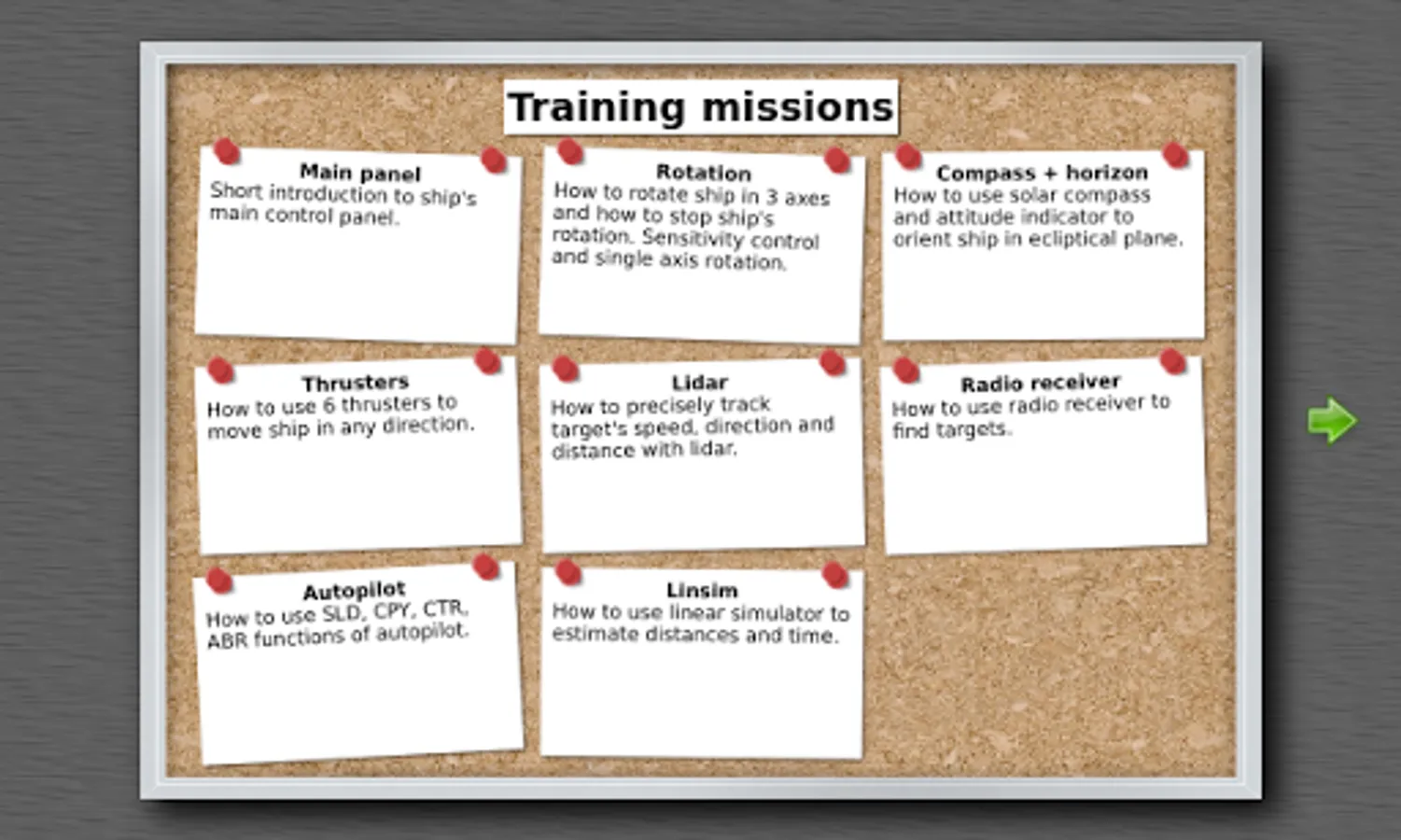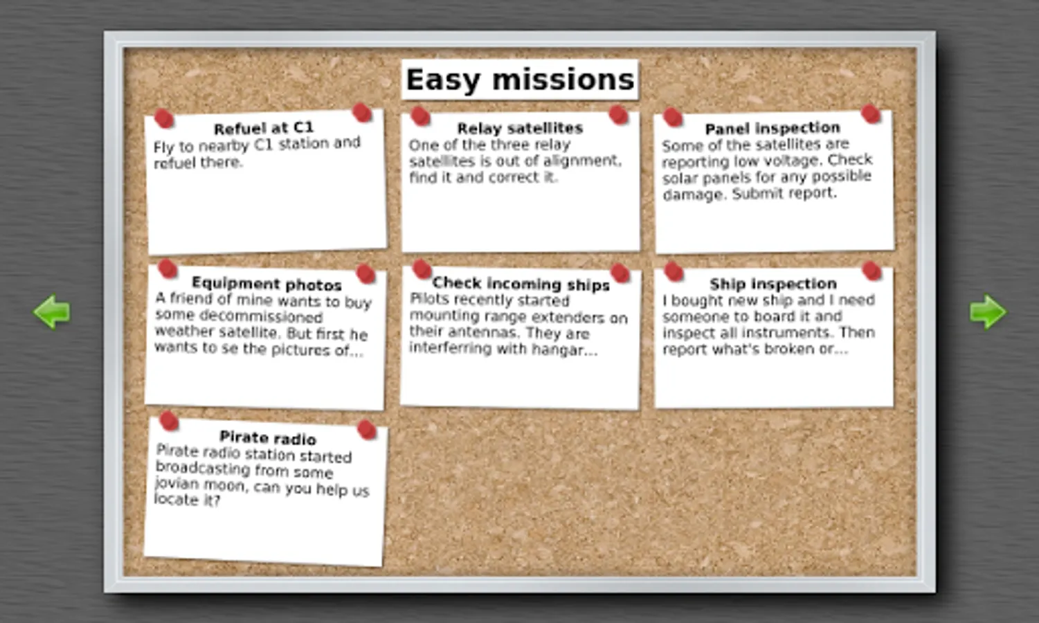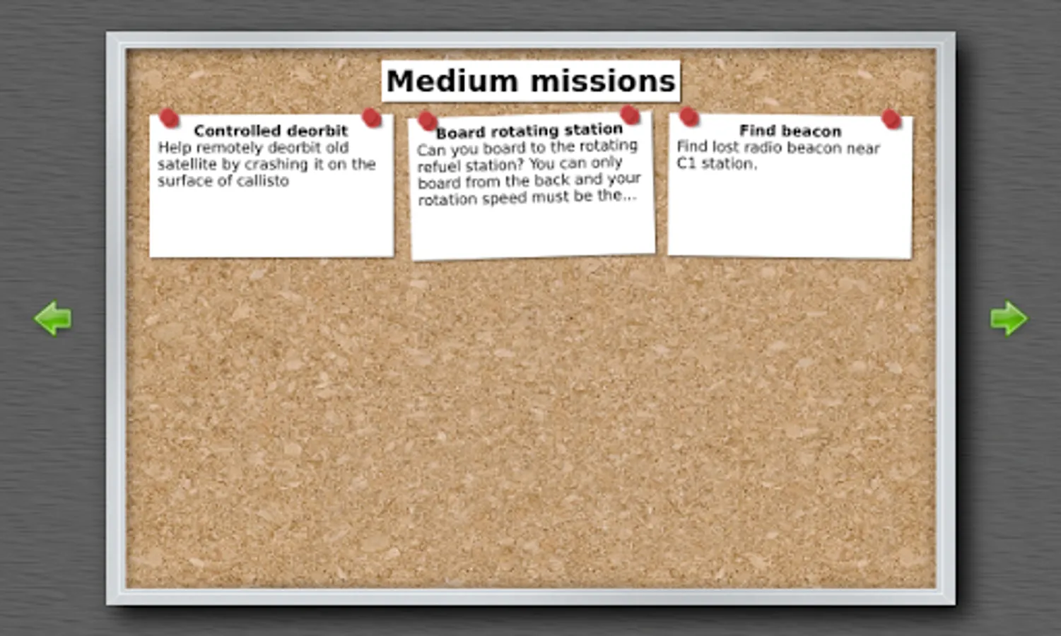 You are a pilot of a small space ship on Jupiter's moon Callisto. First you will go through few training missions and then you can start completing various missions: Refueling, finding lost equipment, checking for damages, using radio to find pirates, checking ships, docking and many more.