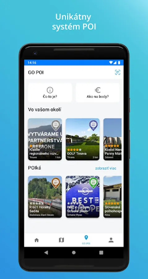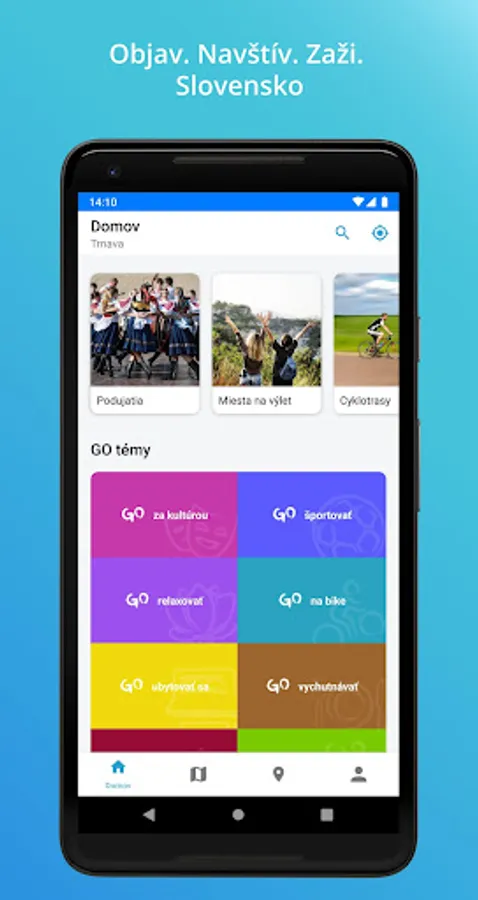 You can discover the unknown, visit interesting places, experience regional products and attractions from all over Slovakia with this app. Be active, download the new app Go Slovakia and start being GO. Use it wherever you get off your car or train, jump off a bike, or walk.