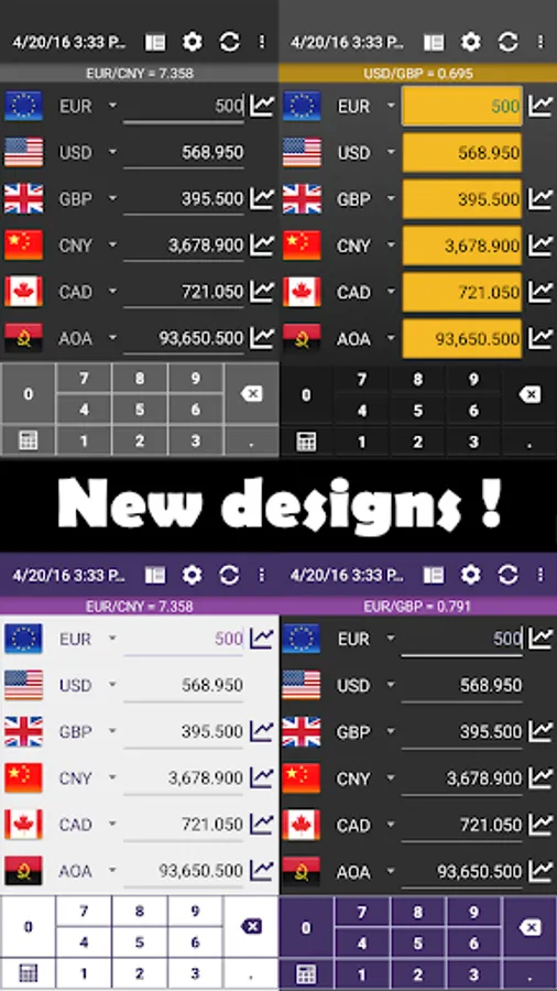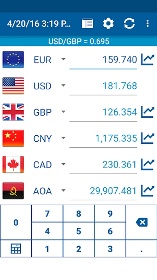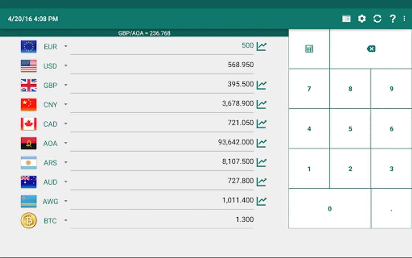 This app will do exactly what you'd expect of it during the vacation in some country. It's main advantage is that you can choose up to 15 currencies that are visible on mainscreen.