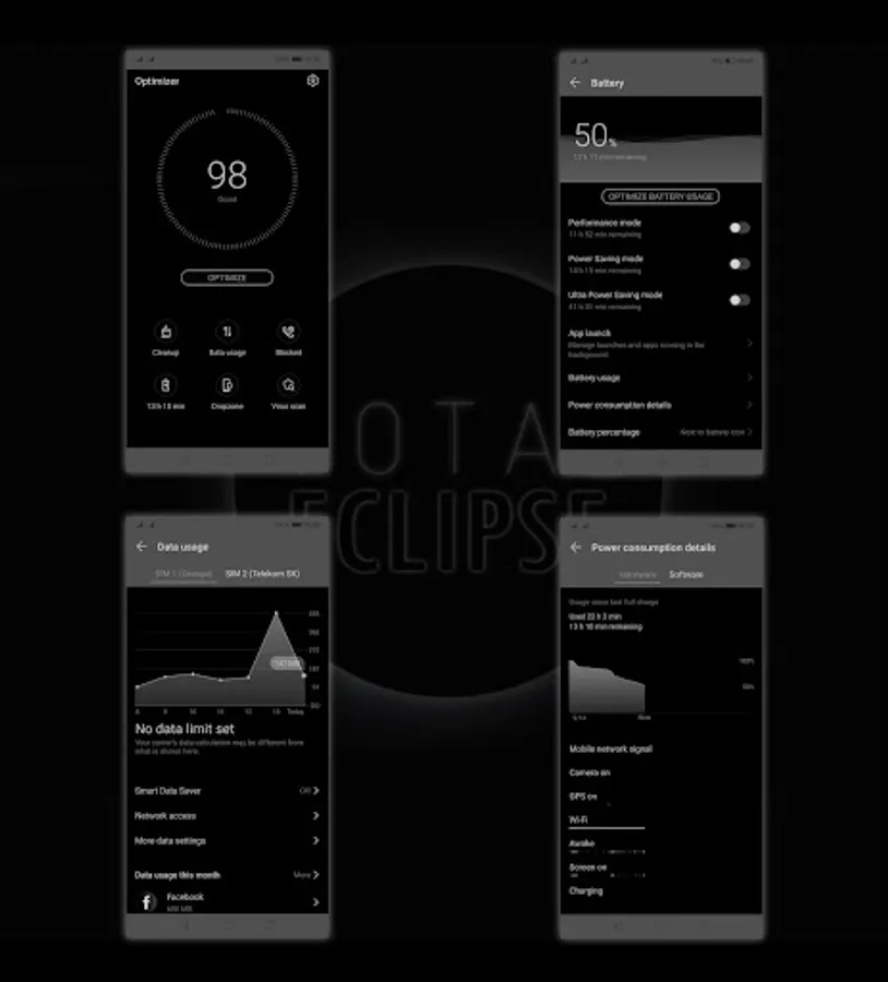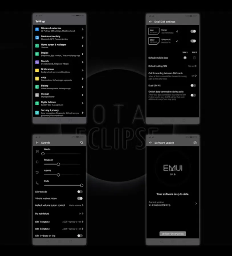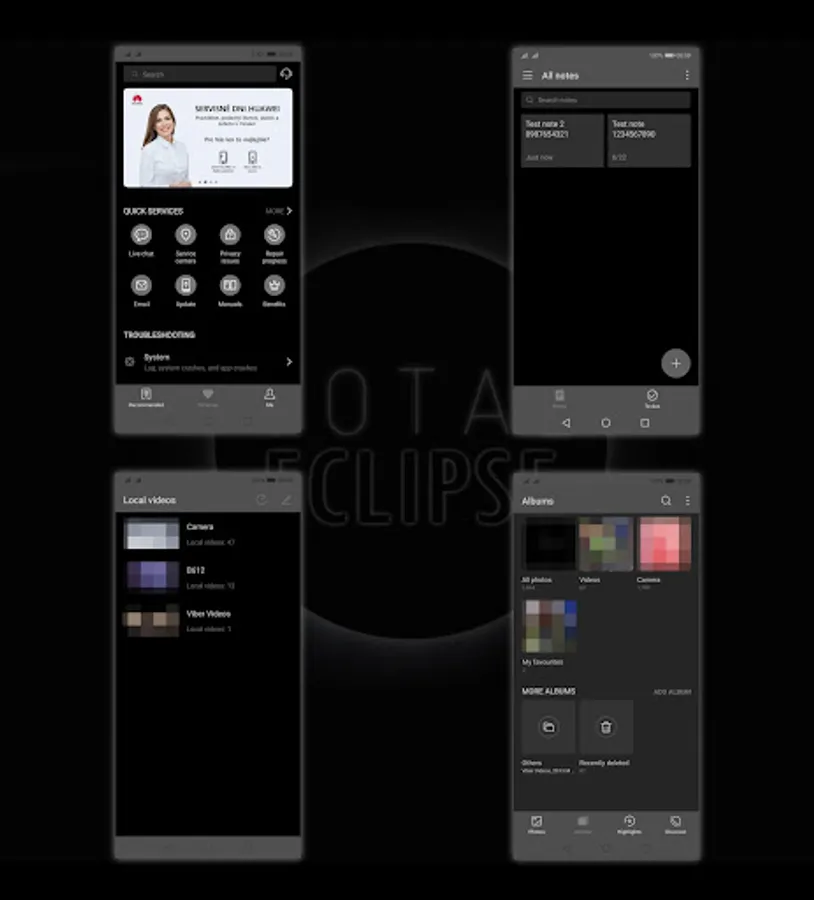 Total Eclipse Theme for EMUI 9.1 is different and cannot be updated from older EMUI system. There are many graphical compromisses, because status bar icons and navigation bar icons are not visible on a black background on devices with LCD displays (without Dark Mode).