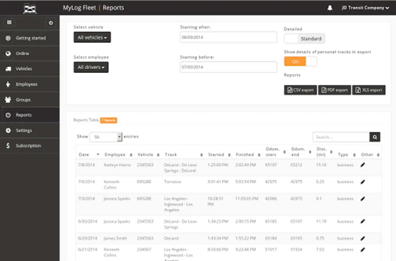 Manage your fleet and generate reports for arbitrary period of time. Generate professional reports in PDF, XLS, or CSV files per whole fleet.
