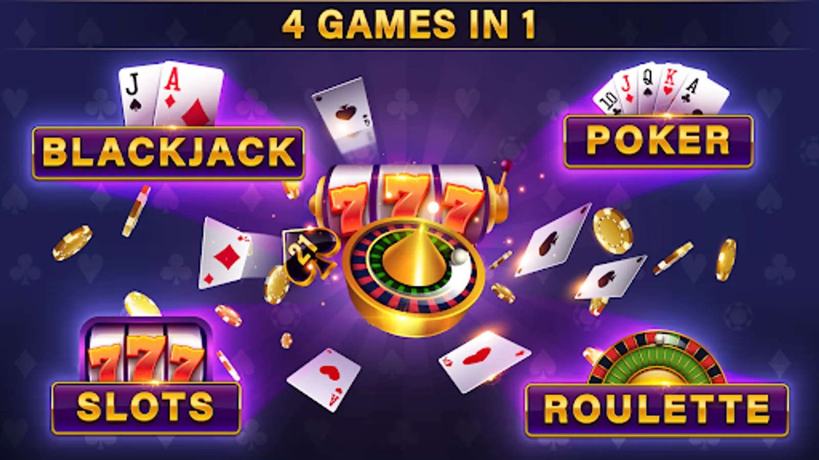 ★ 4 games in 1 - ROULETTE, BLACKJACK 21, VEGAS SLOTS and POKER GAMES