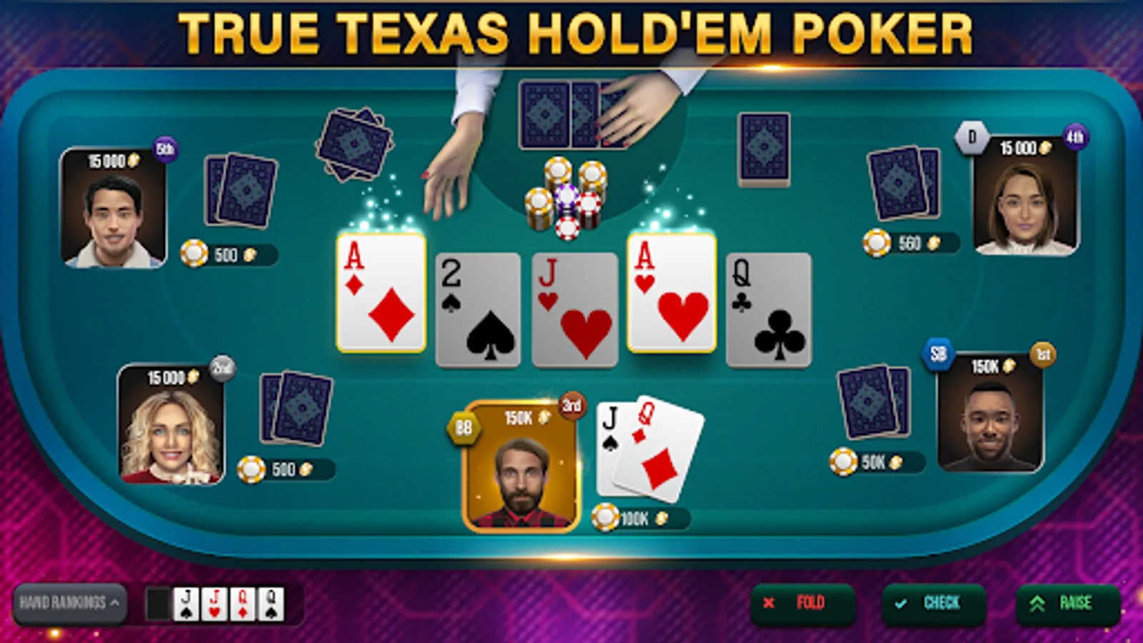 Try out different betting strategies, such as raising, calling, or folding, and become a pro at making quick decisions in poker games for free. This ultimate Texas hold em poker tour is easy to play, but challenging to master, so improve your betting skills, bluff with a convincing poker face, gain experience in casino games, make a full house or royal flush on the table, have fun and become the best player in the world poker game!