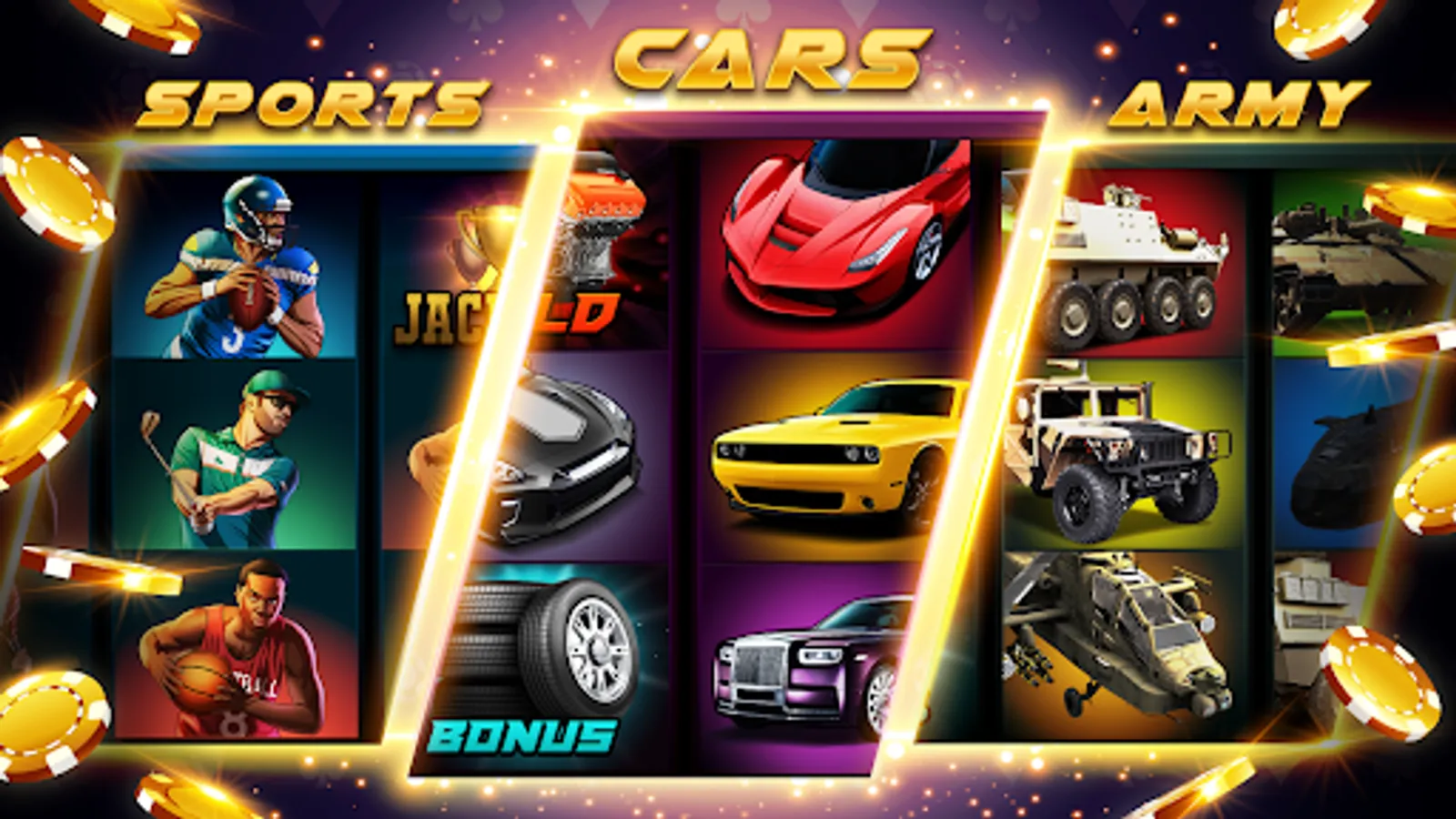 Choose one of three multi-line slot games, like world Sports, Cars, or Wars, spin the reels and become the master of online casino slots!