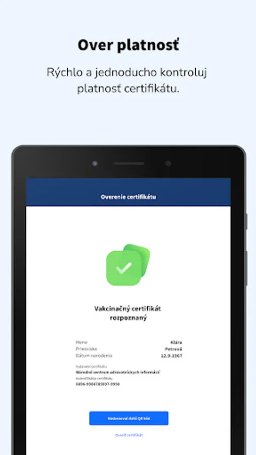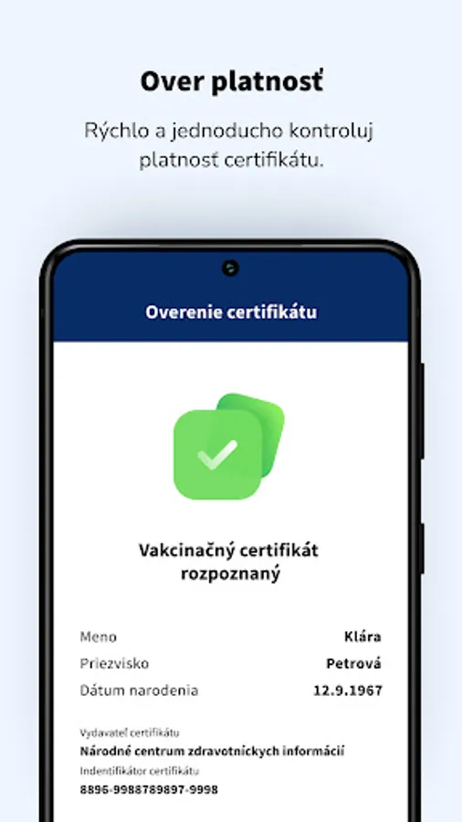 Free official application of the Ministry of Health of the Slovak Republic, the Ministry of Investment, Regional Development and Informatization of the Slovak Republic, the National Center for Health Information and the Public Health Office of the Slovak Republic, which helps verify certificates when traveling or visiting shops, services and other facilities.