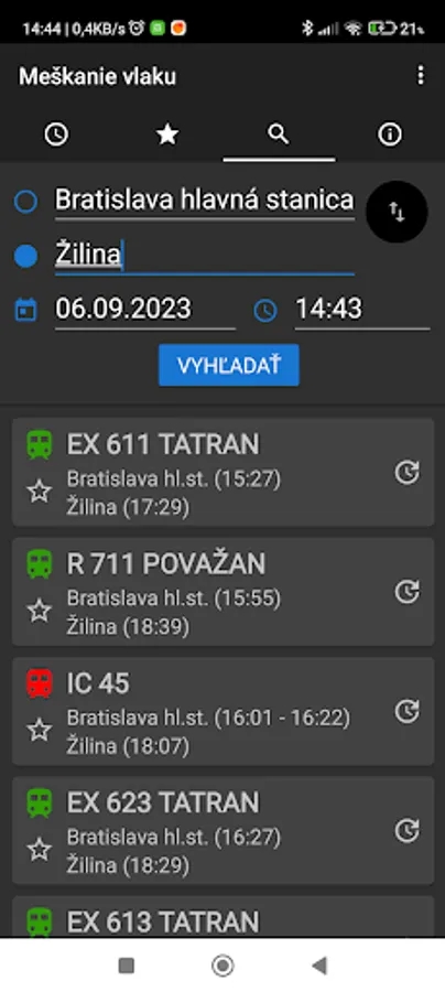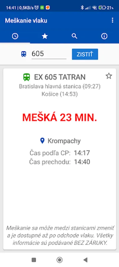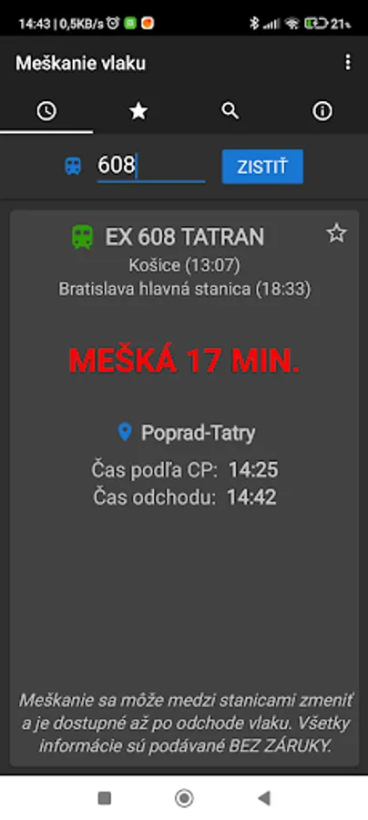 The application lets you check current train delays, which are on track ZSR Slovakia, respectively. and some international trains (train delays LEO Express and RegioJet in the Czech Republic is not available).
