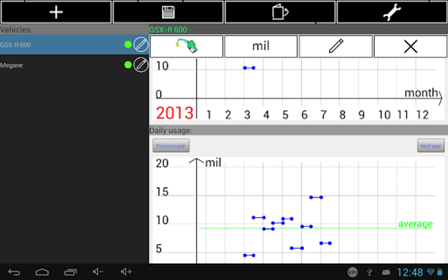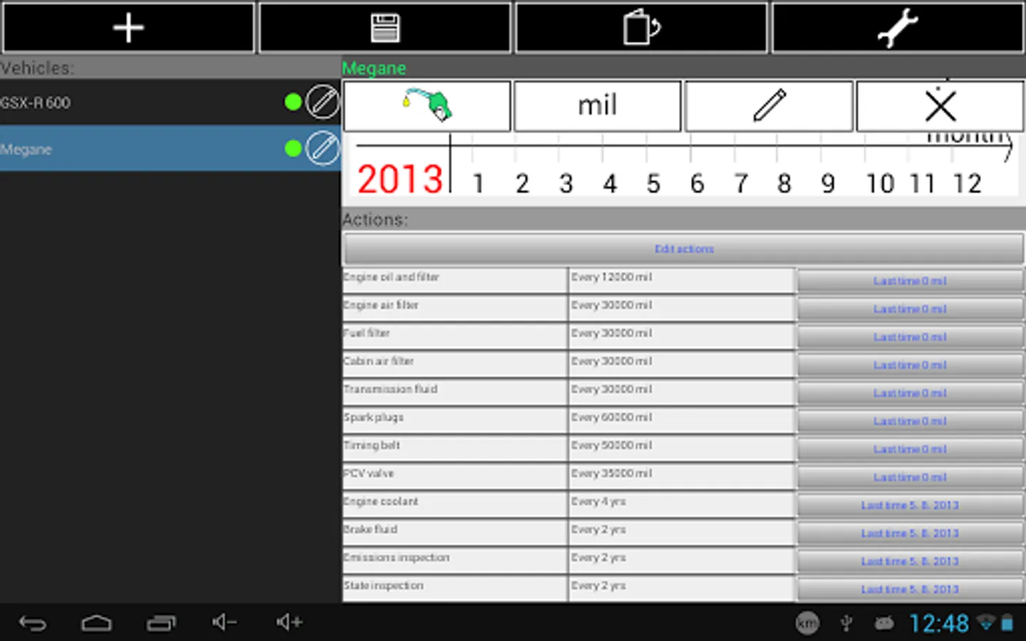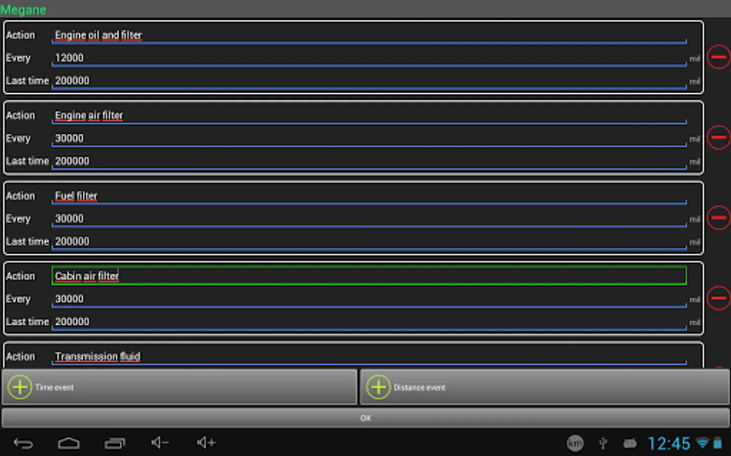 This app records maintenance data, computes MPG (fuel statistics) and usage statistics. It will notify you about the upcoming scheduled events.