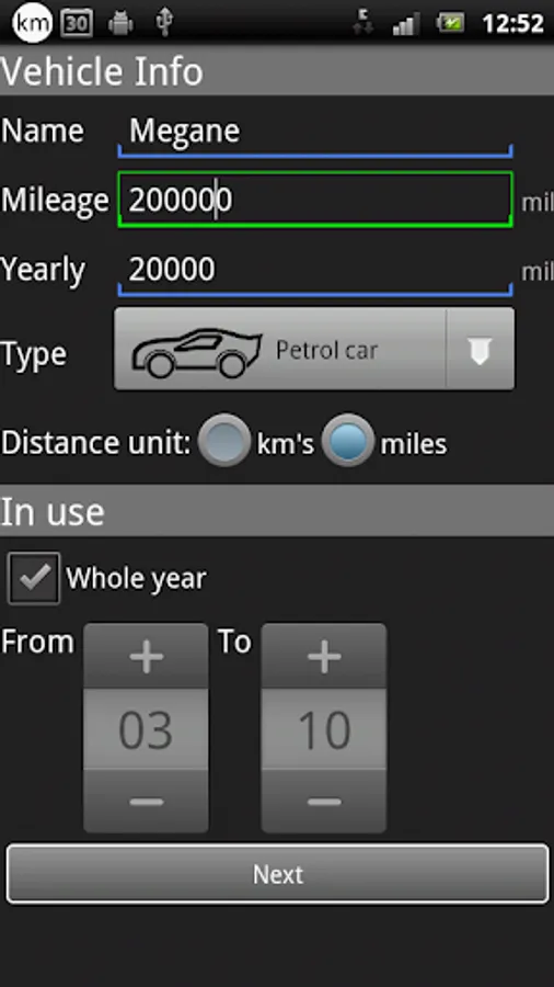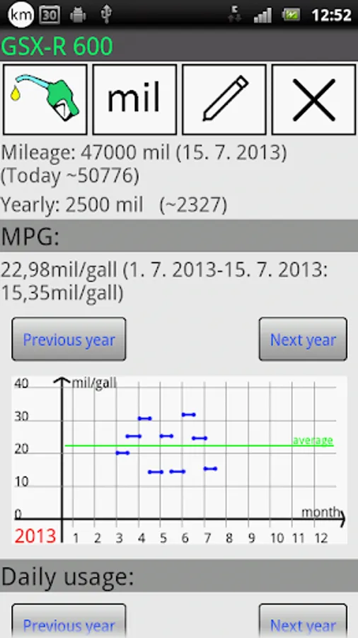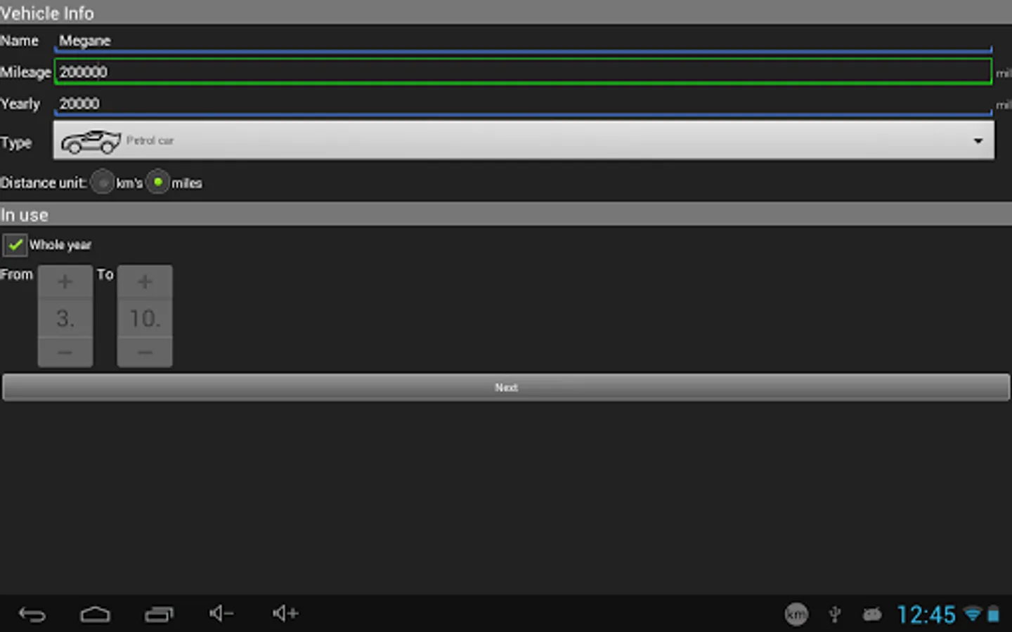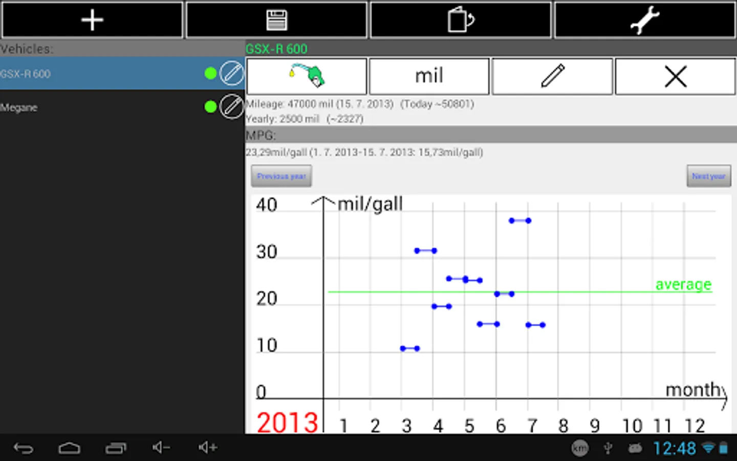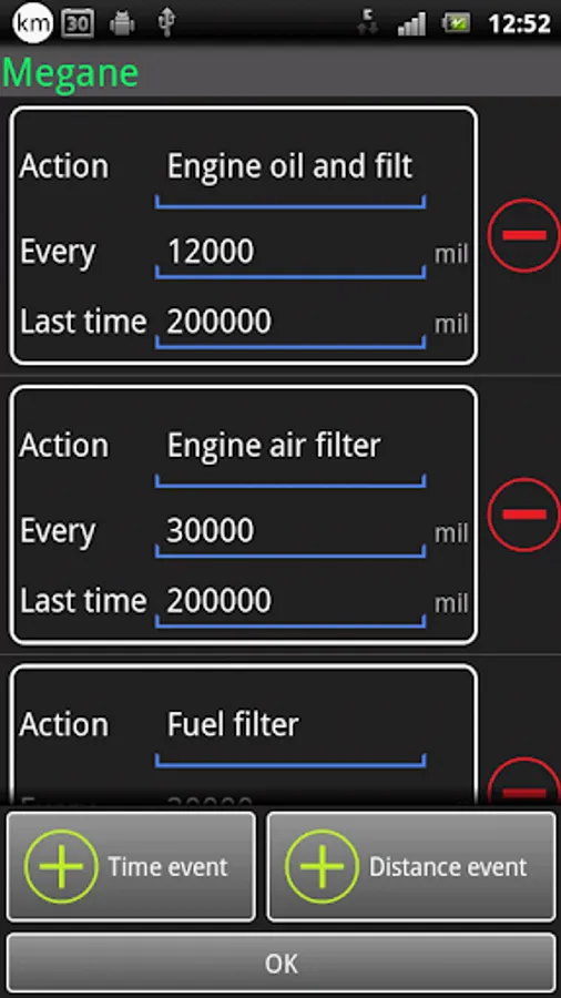 This app records maintenance data, computes MPG (fuel statistics) and usage statistics. It will notify you about the upcoming scheduled events.