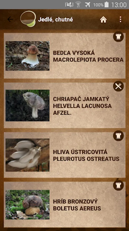 Simple instrument to replace the mushroom with an intuitive search. The application contains 60 famous mushroom classified into seven categories.
