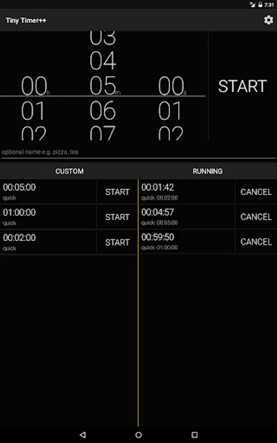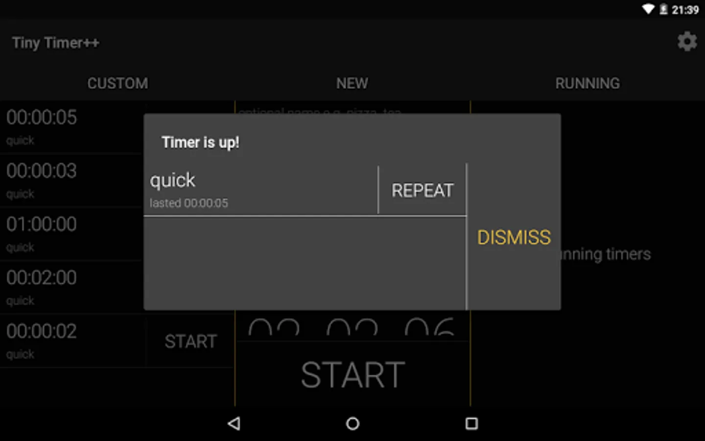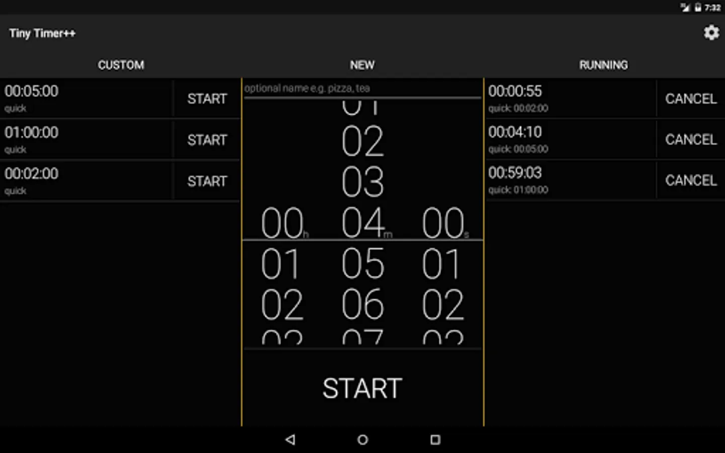 Phone UI: Swipe left or right to access the running timers (where you can cancel them) or a list of used timers (where you can start and delete them).