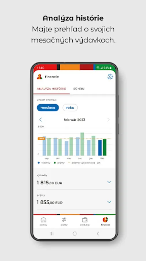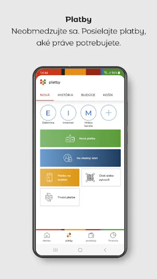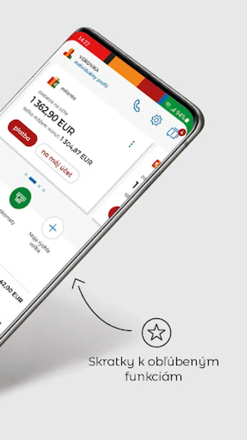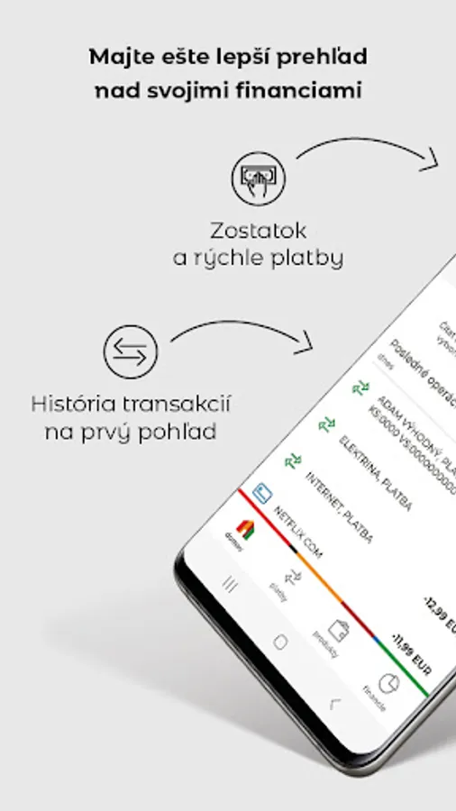 - Prihlásenie a každý úkon potvrdzujete vami zvoleným unikátnym PIN kódom alebo pomocou odtlačku prsta, prípadne skenu tváre.