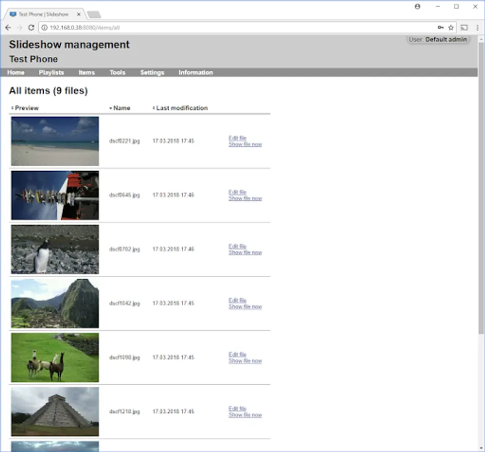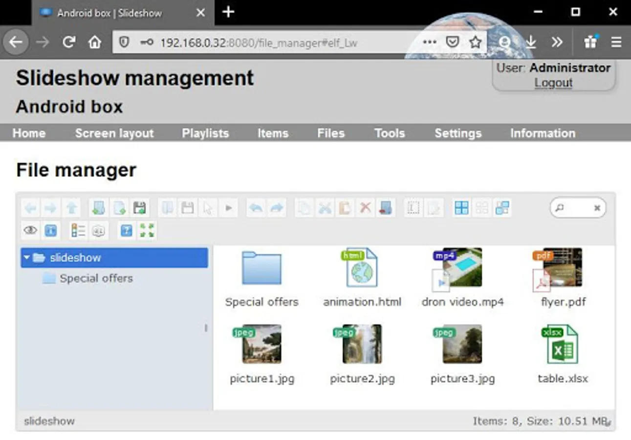 Uploaded files are shown in cycle, either randomly (on shuffle) or alphabetically. Through the web interface, you can setup various playlists and screen layouts and schedule them to different parts of days and days of week.