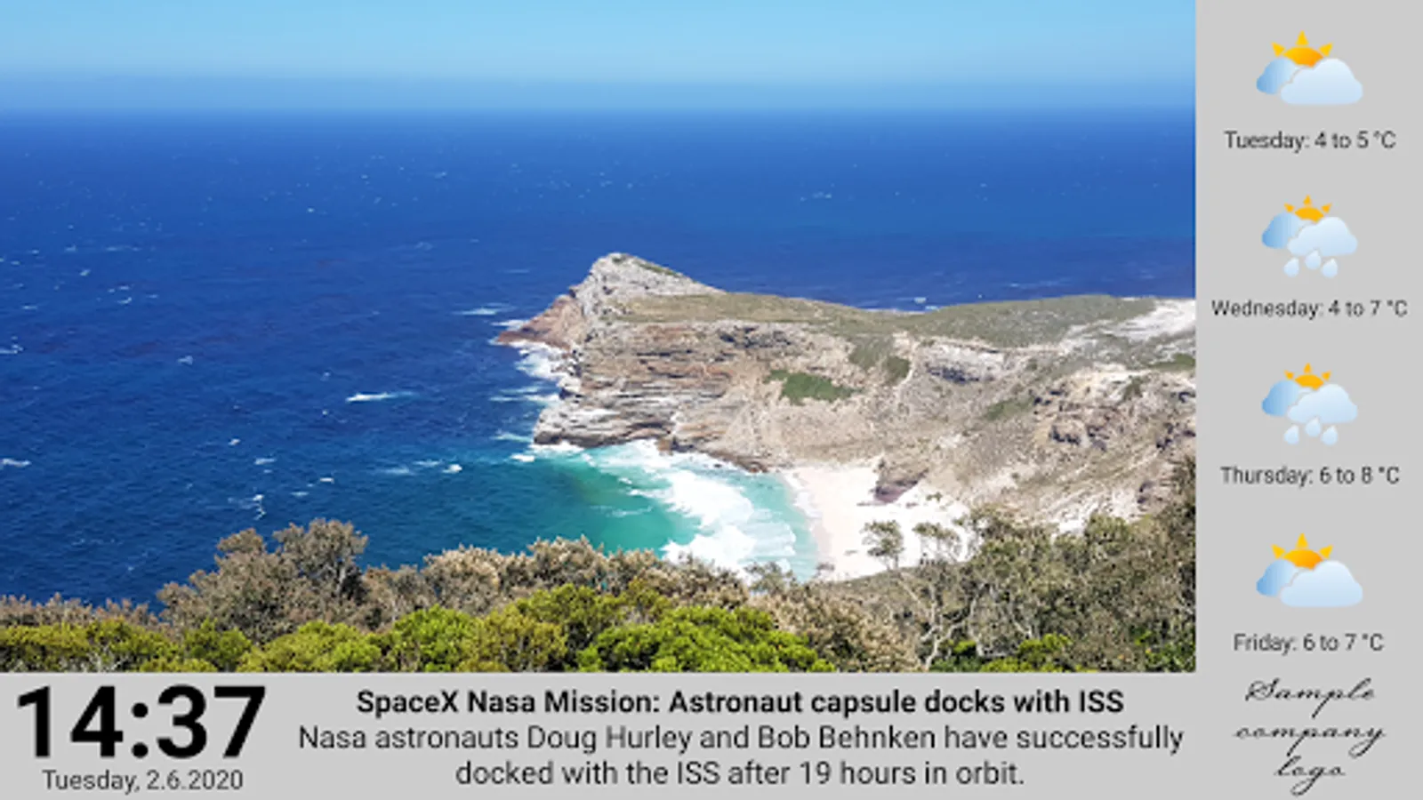 Slideshow can display various image, video and audio formats, even Excel sheets, PDF, HTML files, websites and YouTube videos. You can also add zones with the current date & time, RSS news and weather forecast in fully customized layouts.