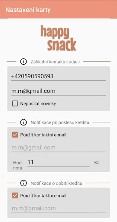 ! ATTENTION, the brand new card must first be activated at www.happysnack.cz/muj-ucet/ (login), where you can set a password and email. You can then add it in the application, the unactivated card will not work properly.