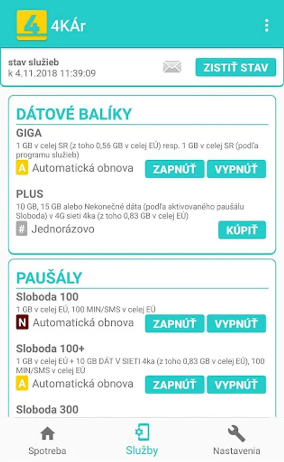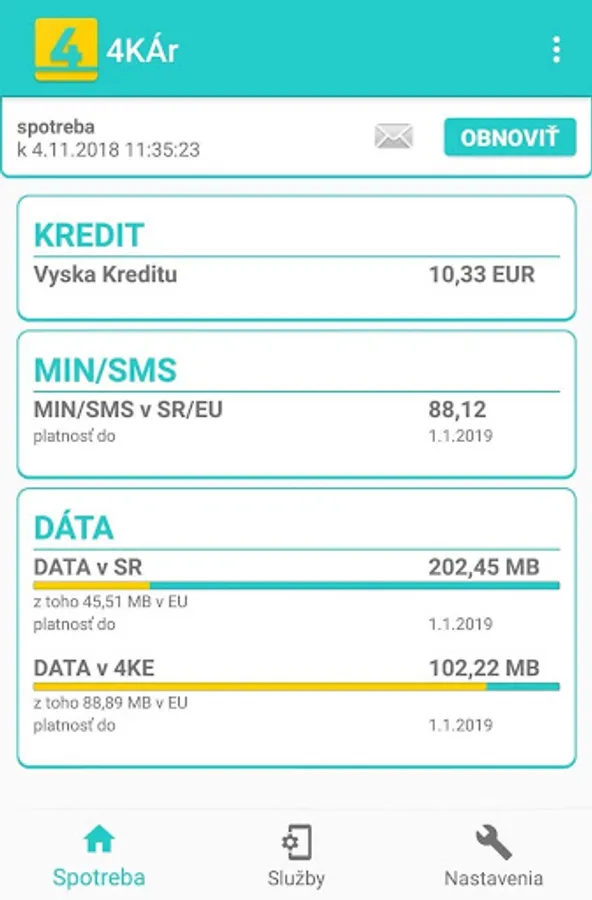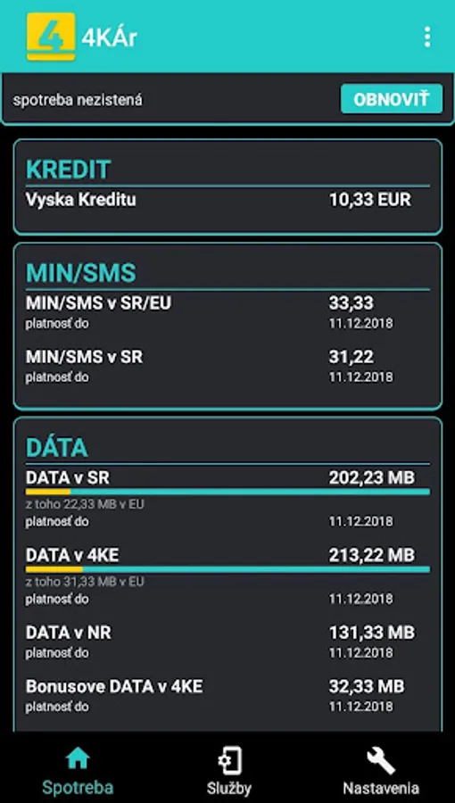 The application is intended for customers of Slovak mobile operator 4KA. It is designed to graphically visualize consumption items and facilitate the setup of data and voice services.
