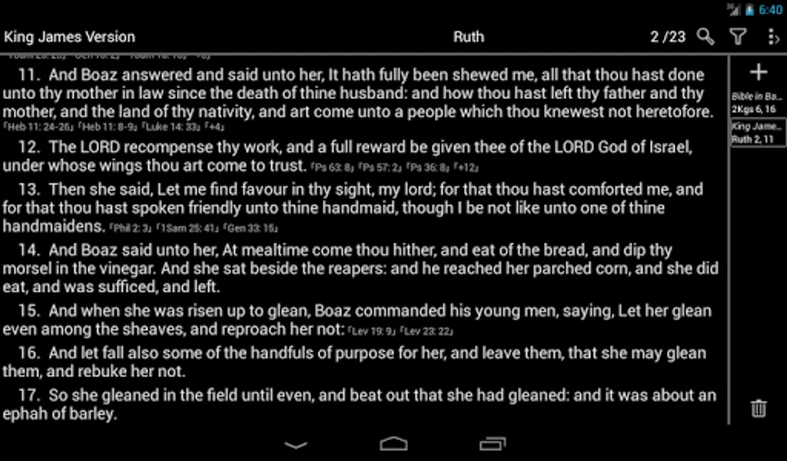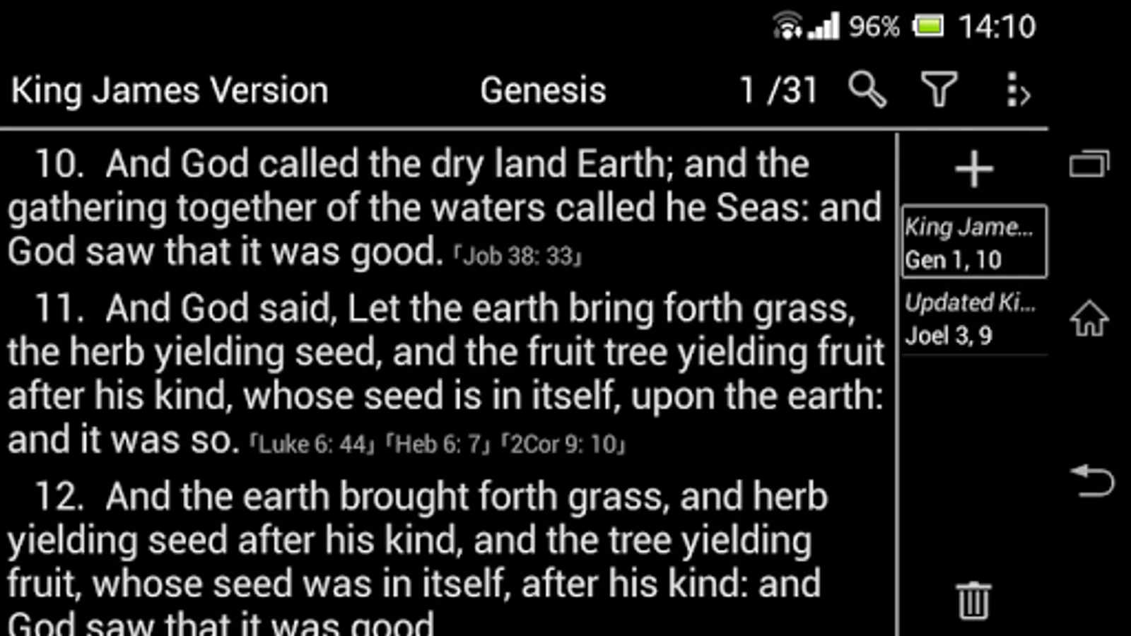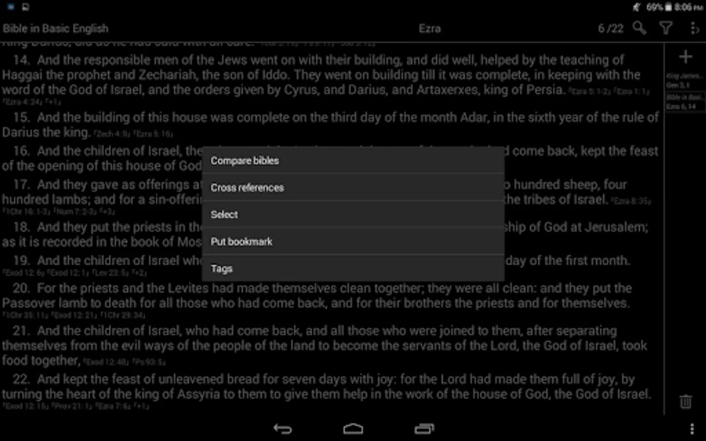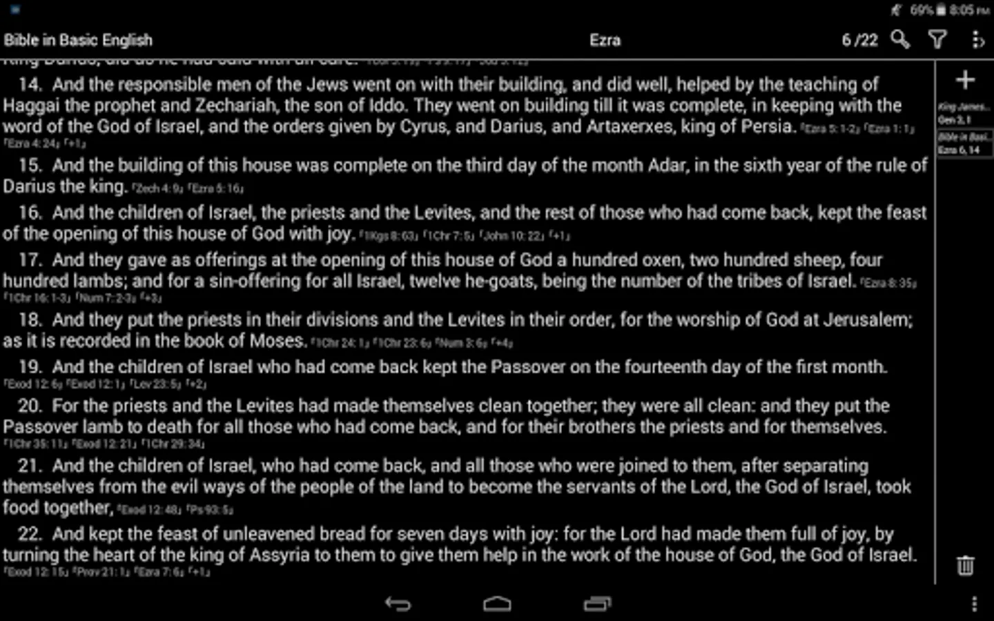 ✔ Tabs. You can open verse references from same bible or from another bible in different tabs. Sorting tabs is allowed.