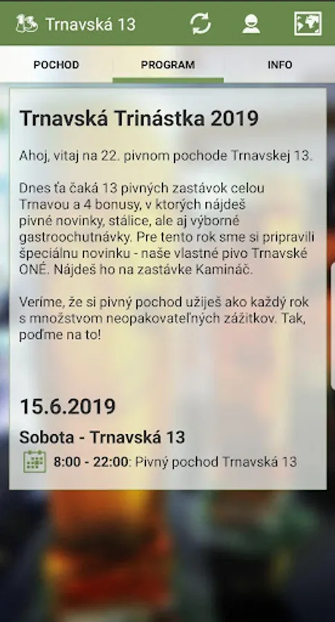 Majte so sebou program pivného pochodu, za sebou puby, v ktorých ste sa občerstvili a pred sebou zastávky, na ktoré sa tešíte. O všetkých podnikoch máte aktuálne informácie, fotky podniku, každý podnik na trase môžete oznámkovať a pridať komentár.