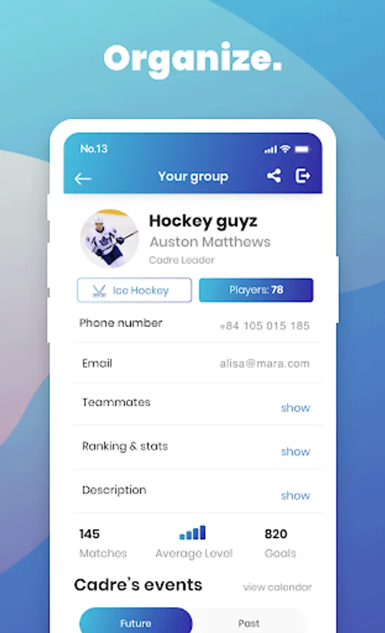 1. Organize your game - create your group and invite friends. Track RSVPs, then organize the game by splitting players into teams. What are the odds of your team winning? Scorentino gives you prediction based on your previous games!