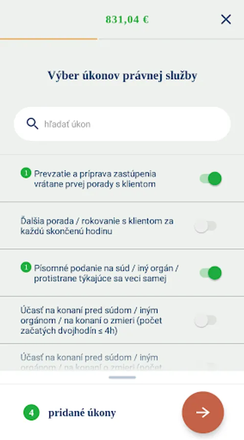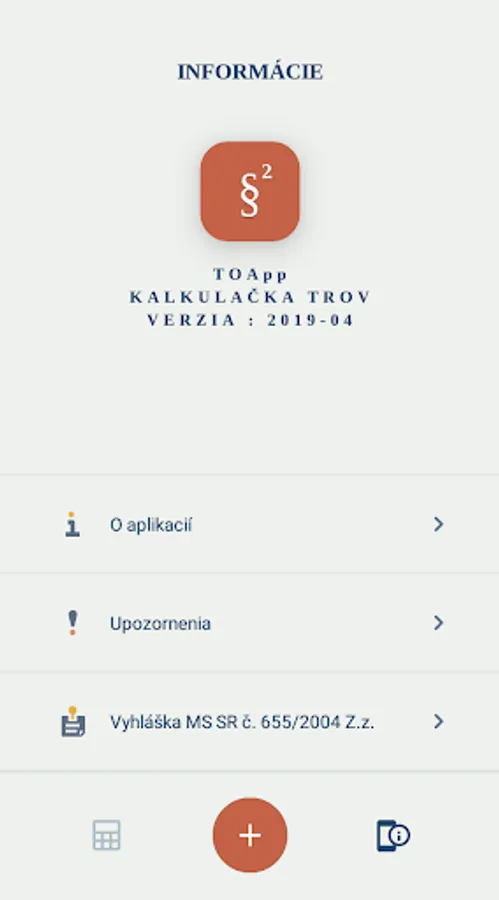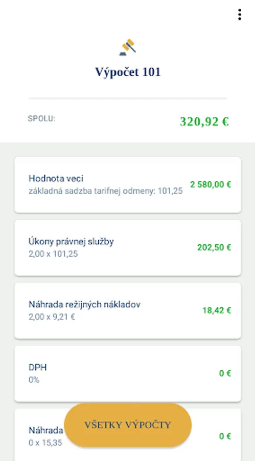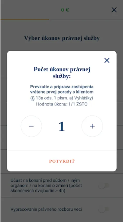 The application serves as an auxiliary information and technical tool for the individual need to calculate the lawyer's tariff remuneration for representation in civil proceedings, in criminal proceedings and in proceedings on offenses and in some special proceedings pursuant to Decree of the Ministry of Justice of the Slovak Republic No. 655/2004 Coll. on remuneration and reimbursement of lawyers for the provision of legal services (hereinafter referred to as "the Decree").