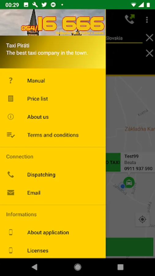 You can find us at Kacvinská 2849 Bardejov. Four officers (transport supervisors) work there. Our service is available 24 hours a day. There are more cars belonging under one telephone number. We have 15 normal ordinary cars, one micro bus with 8 places for passengers and of course, we are still increasing our possession and service. Our phone numbers are: Central control room (dispatching): 054/16 666, mobile phone numbers: 0918/699 999, 0903/699 999 .