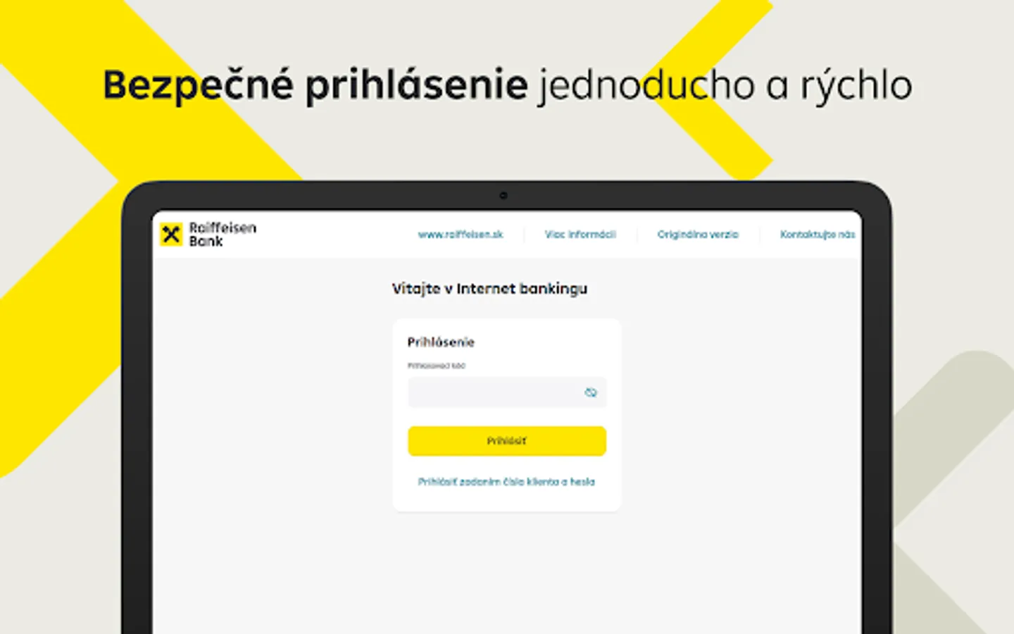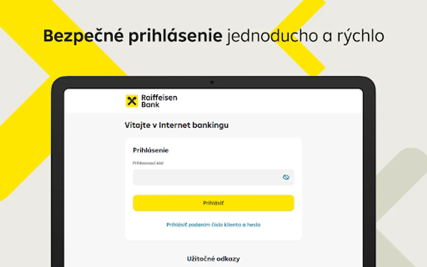 To log into Raiffeisen Bank Internet Banking, enter your client number (given in your Framework Contract with us) and your Internet Banking password, and then confirm the login using the code you receive from us in an SMS. After logging into Internet Banking using the Raiffeisen Bank SK application, you can create a quick login option. When using the quick login option to access Internet Banking, simply enter your own numeric login code. This code is only valid for the mobile device and the browser you used to activate the quick login option.