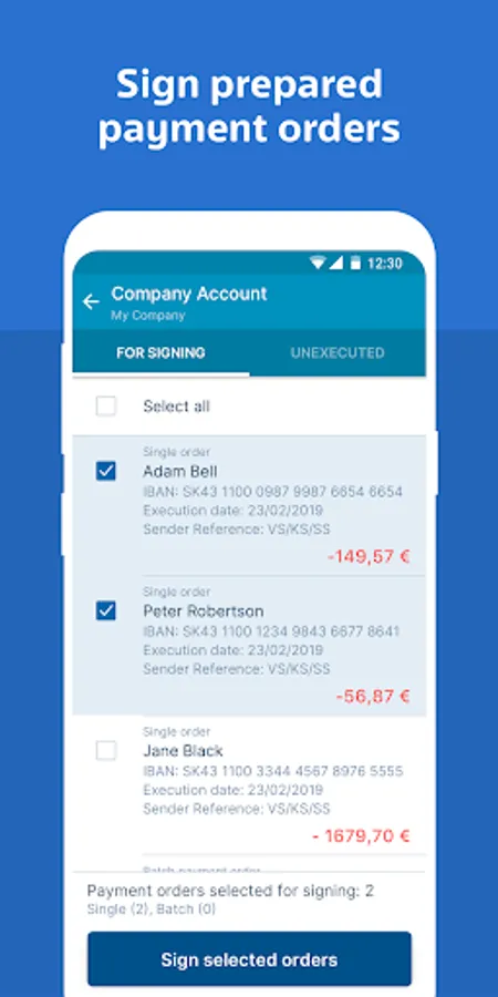 The mobile application allows you to sign payments prepared for you by your accountant or other authorized person. You can also view the list of unrealized transactions, including the reason for their non-execution; you can then repeat or delete them.