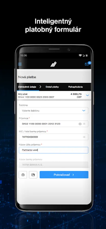 For the first login to the application, it is required to enter your PID and the password which you use for the desktop version of Business BankingTB. Next, you have to confirm your login with a code generated by the ReaderTB mobile application (a physical card and reader provided by Tatra banka can be used as well). To further use the application, you can choose between two login options. The first option is to login by using PID + password + ReaderTB, and the second option is to set up a PIN code. The PIN code set in the mobile application can only be used to log into the Business BankingTB mobile application on that particular device.