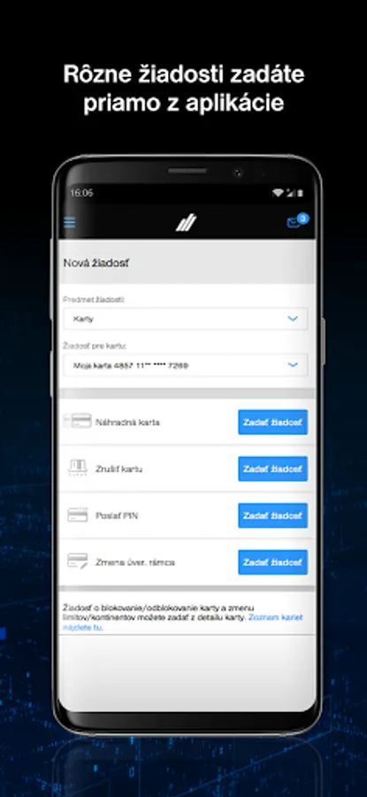 New request gives the user the option to place various types of requests without the need to visit a bank branch. For example, card or loan requests are also available.