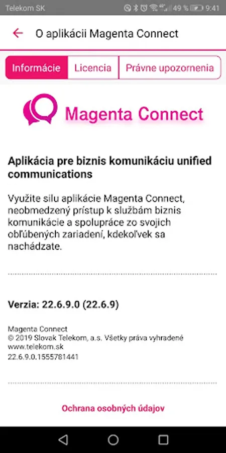 To use this application it is also necessary to activate the relevant service (Magenta Connect) on the side of Slovak Telekom, a.s. For information on activation of the Magenta Connect service, please contact your sales representative at Slovak Telekom, a.s. You only need to activate the necessary additional service to log in to the application.