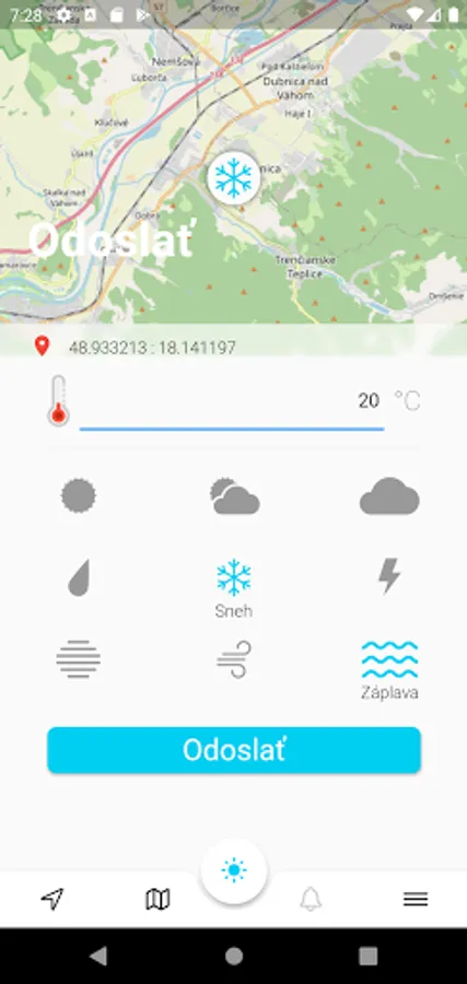 Ovládacie prostredie aplikácie je veľmi jednoducho ovládateľné. Informácieoaktuálnom počasí sú získavané prostredníctvom používateľov tejto aplikácie.Používateľ veľmi intuitívne zadá údaj ostave počasia vmieste kde sa nachádza.Má na výber zmožností ako napr. búrka, dážď, silný vietor, hmla, sneženie,oblačno, jasno apod. Zároveň, ak má používateľ vedomosť oaktuálnej teplote,môže zadať aj túto informáciu. Po odoslaní údajov a na základe automatickéhopriradenia jeho GPS polohy, sa ním zadaná informácia zobrazí na mape preďalších používateľov aplikácie. Informácie sú dostupné na mape po dobu 30minút.