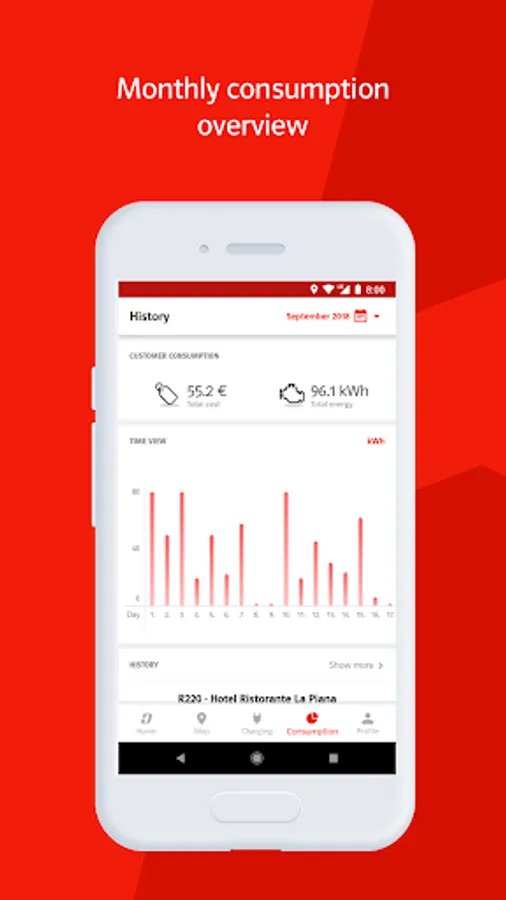 The application also displays the current charging status, it gives you access to your charging history and various reports and statistics to help you evaluate your e-mobility efficiency and track your costs.