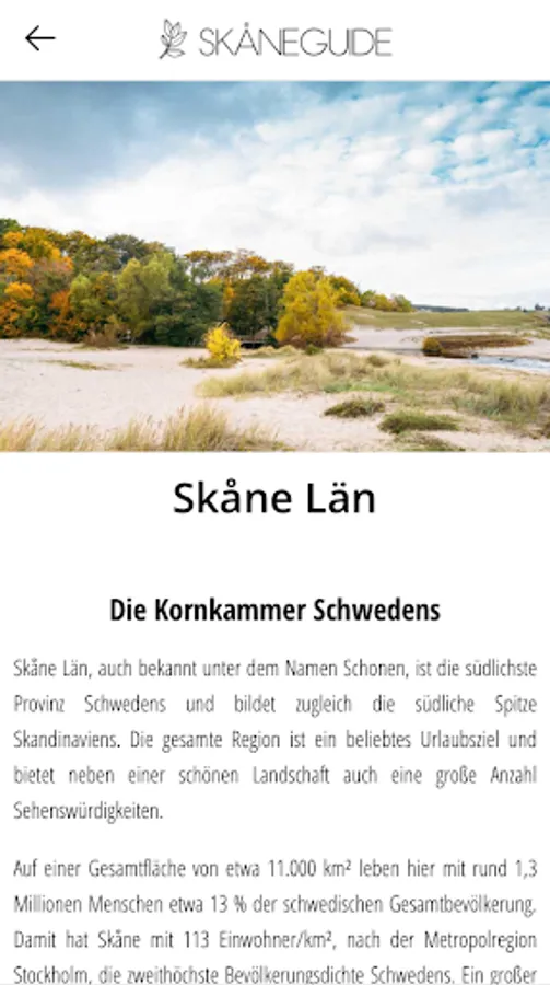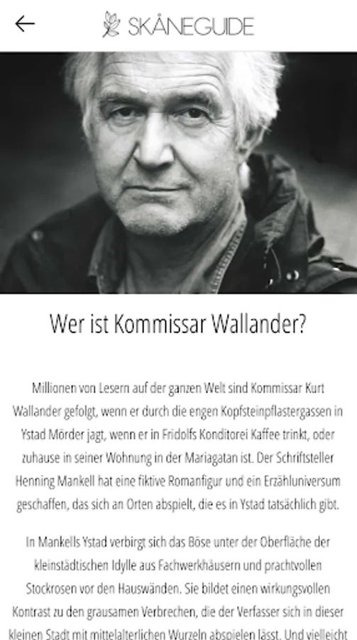 In our travel guide app you will find over 400 destinations in the southern Swedish region of Skåne län. Including over 50 beautiful beaches, more than 75 museums & galleries and 40 nature reserves and national parks. In the app you will also find the official Inspector Wallander Guide with over 100 scenes and locations from the novels and film adaptations of Henning Mankell's heroes.