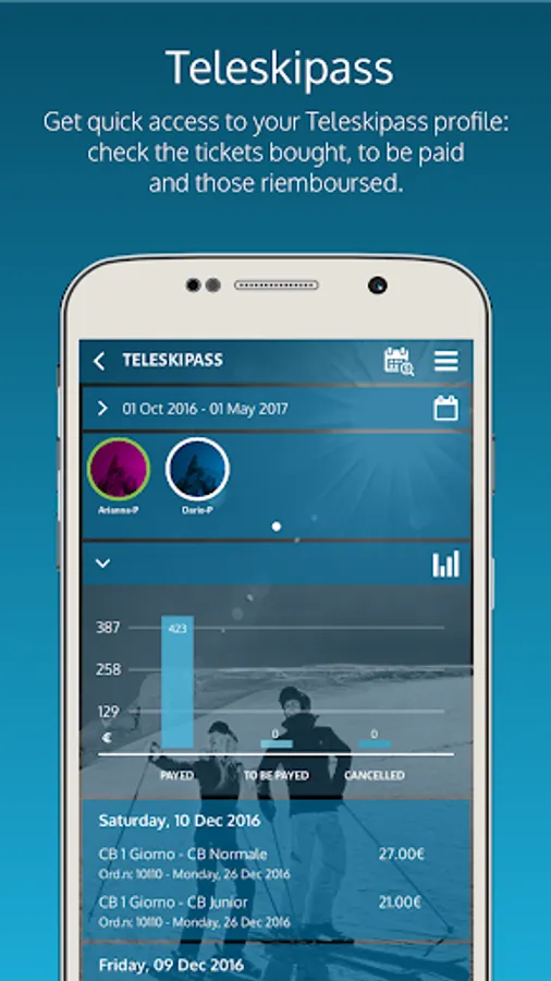 Teleskipass: check the situation of your teleskipass contract, the tickets bought, to be paid for or reimbursed. Create and manage your own ski team.