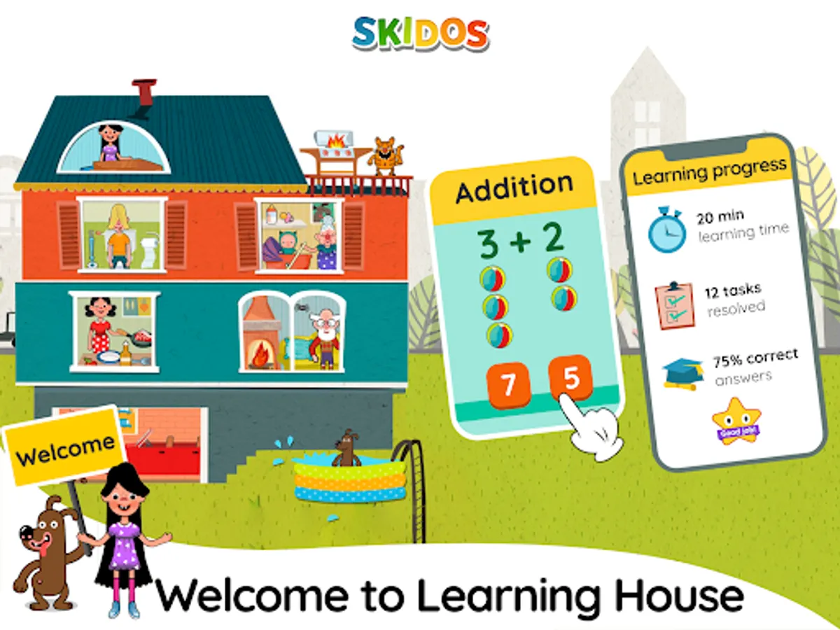 Play the new house game by SKIDOS and witness exciting new tasks. Play with new characters along with the learning content in the game. Learning House is a fun educational game where kids can learn daily life in a household and become better at number and letter tracing, or mathematics! The game offers multiple activities in 8 areas of the house, as well as 10 different characters - a sweet family with cute little pets.