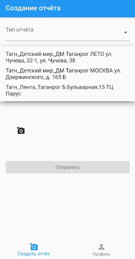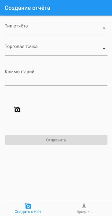 Application for sending reports after completed work. Includes a list of outlets, report types to fill out, and a photo tool.