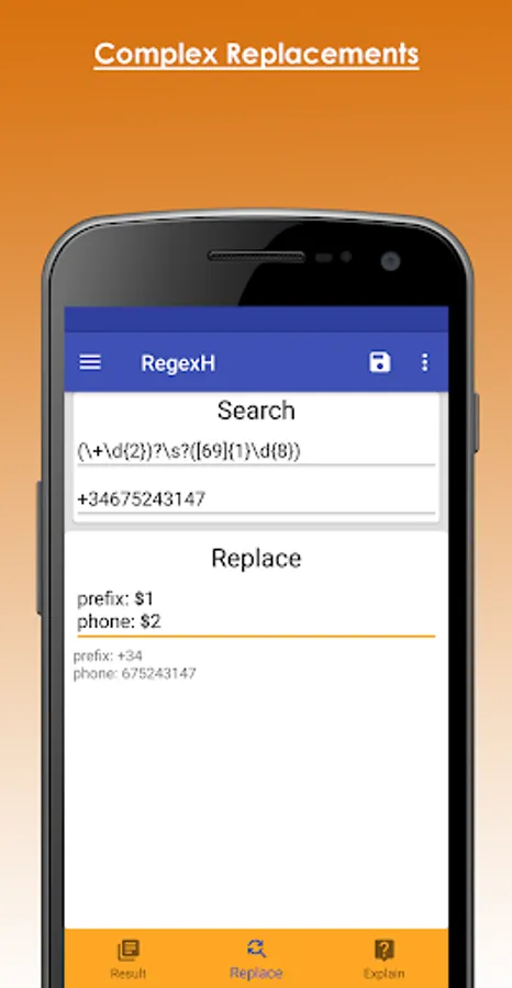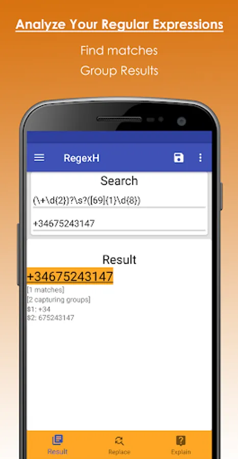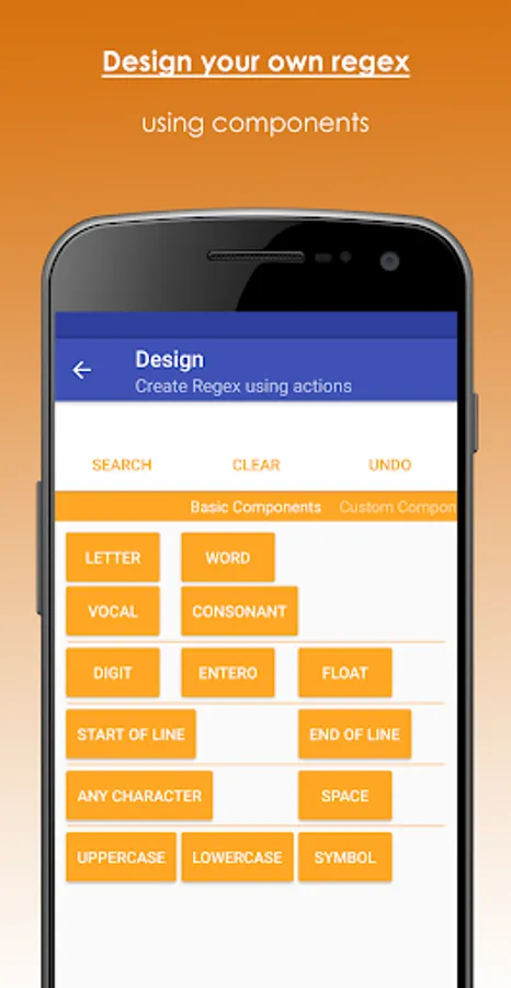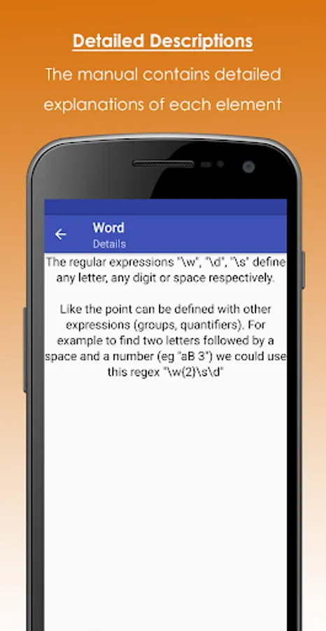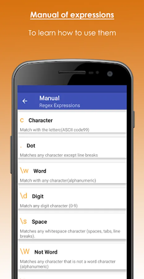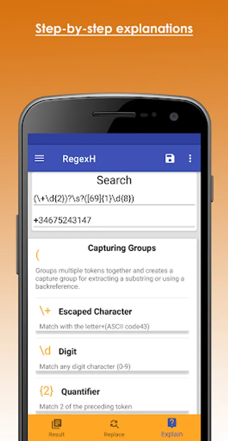 With this application you will be able to understand a regex expression, thanks to the complete explanation of each of the elements that compose it. In addition, it allows you to design regular expressions by just selecting pre-established components.