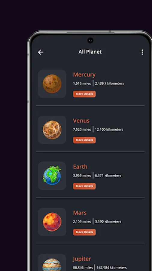 - Show all planet & planet detail like Name,Gravity,Polar radius, Density, Semi major axis.