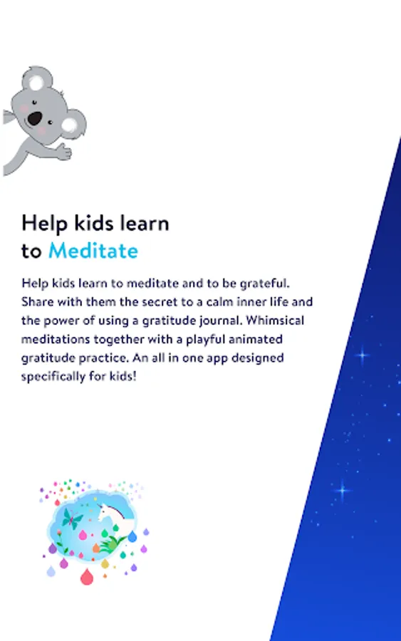 An easy to use, elegant children's meditation app with 100+ meditations, hypnosis, bedtime stories and sleep stories - just for kids! The gratitude journal along with whimsical kids meditations and hypnosis stories, beautiful music, sound effects and story, this simple app provides the platform for children to learn about mindfulness and gratitude. Mindfulness and gratitude form the basis of a happier, healthier and more authentic life.