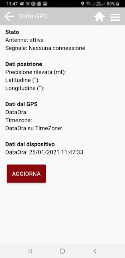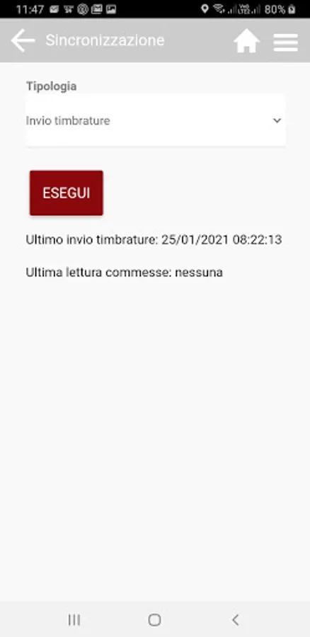 The App displays: dashboard status; a button for the acquisition of stamping; a server sync button; a setup menu.