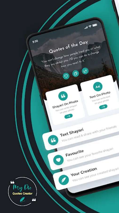 Now write text on photo using My Pic Quotes & Status Creator, You can save the quote design that you have made by customizing. You can also change the background of the quote. You can change the text and create images from that quotes and use them for your social network like whatsapp, facebook, twitter, instagram, etc. We also added categories of shayari in this app, you can copy and share this shayari or quotes with your friends and family. You can also Create Quote Image with this quotes maker app.