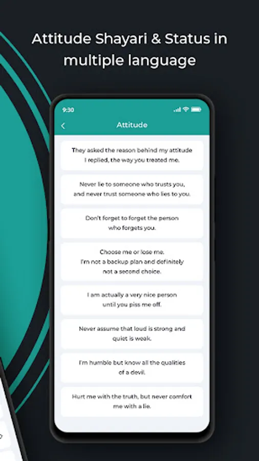 This app has Shayari Attitude status and Love status which includes various category like love, attitude, friendship and all. You can get love status, romantic images and inspirational pics to share with your friends. The app has motivational status for life of fun and enjoying. Express your thoughts & share your feelings on social media, get latest text status app for whatsapp and for instagram story.