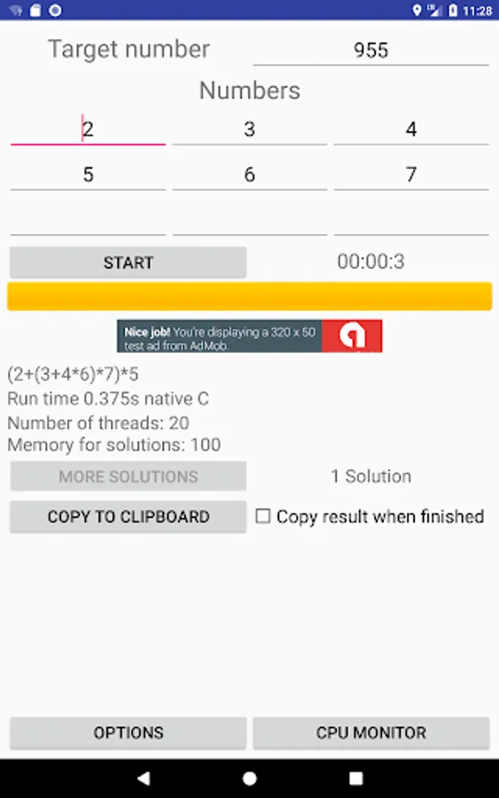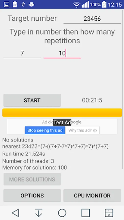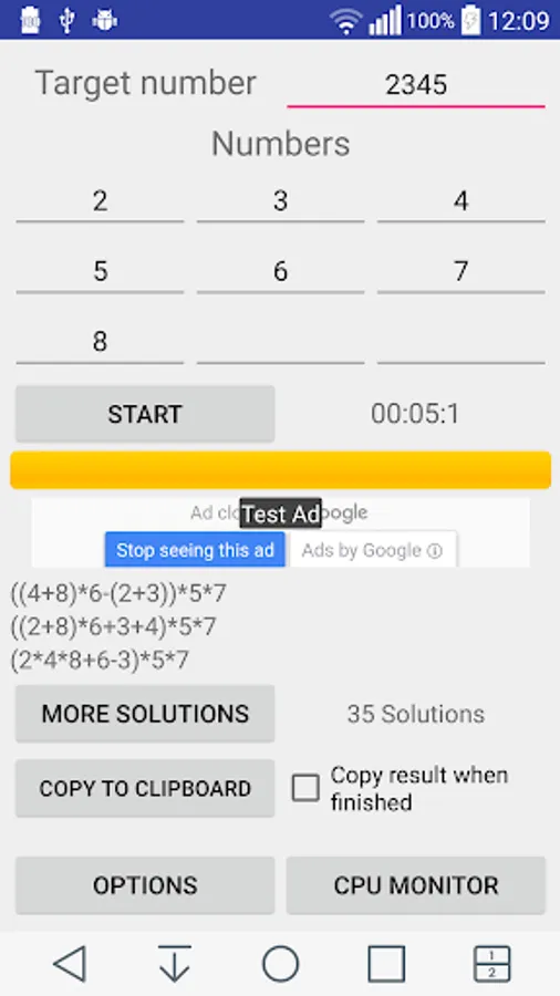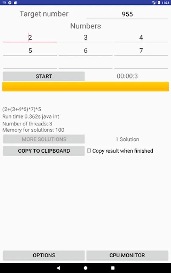 Finds if is it possible to calculate target number from specified numbers using addition, subtraction, multiplication and division, if not gives the closest solution from target. Find and displays all possible solutions, max 1000. User can enter a maximum of 9 numbers (finding solution fron 9 diferent numbers will take a long time).