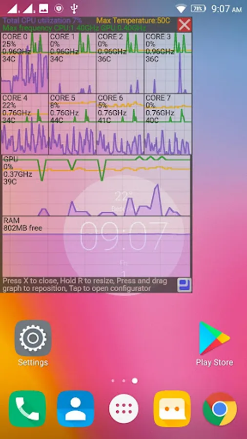 Graph is fully customisable, you can resize, set number of CPUs to be displayed in a row, display CPU or GPU utilization, frequency or temperature.