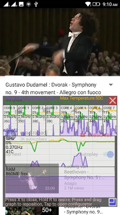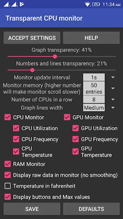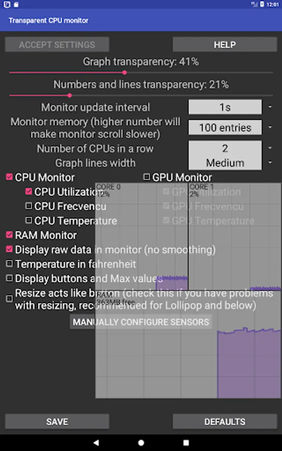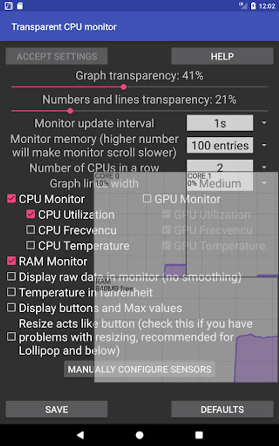 Tapping on graph opens configuration page, where you can enable or disable all CPU or GPU options in real time