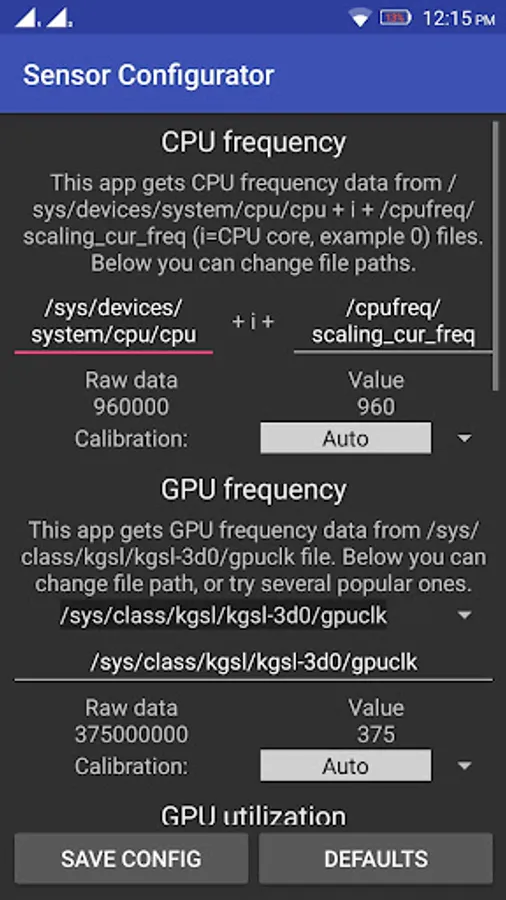 App is configured for several phones, if something doesn't work file paths from where app reads data can be changed on Sensor configuration page.