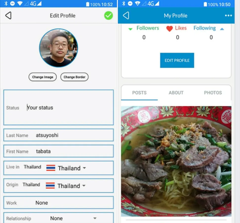 A mix of dating and social networks: timeline, chat, blog post, image post, search, match, video / voice call.