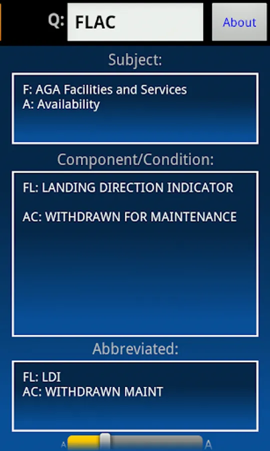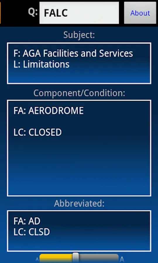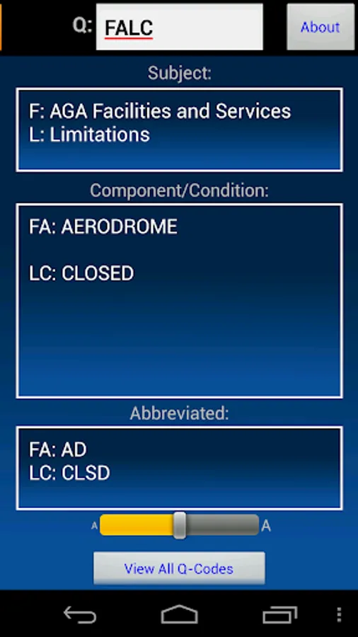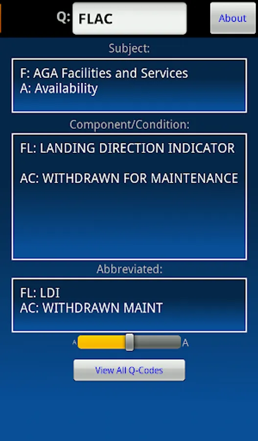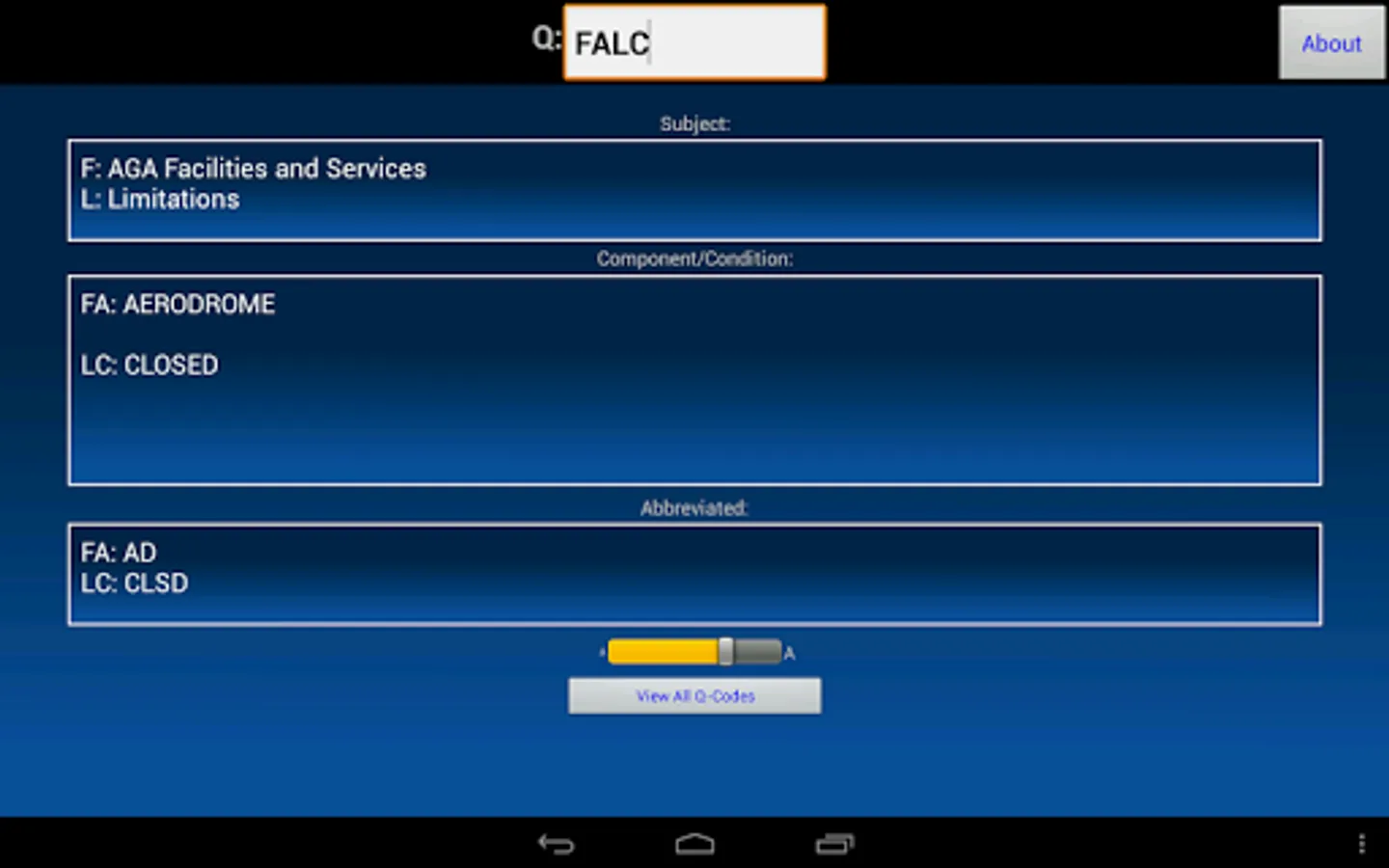 Aviation Notam Q Code decoder. Simply enter the four letters following the Q and the program will display the associated Notam Subject, Component and Condition codes.